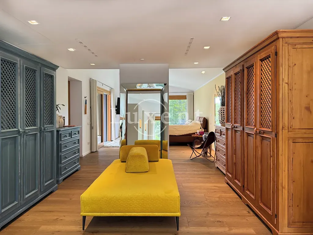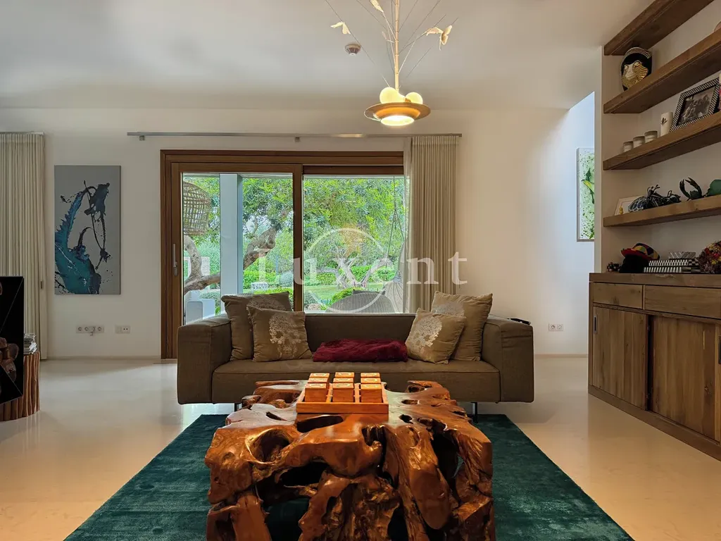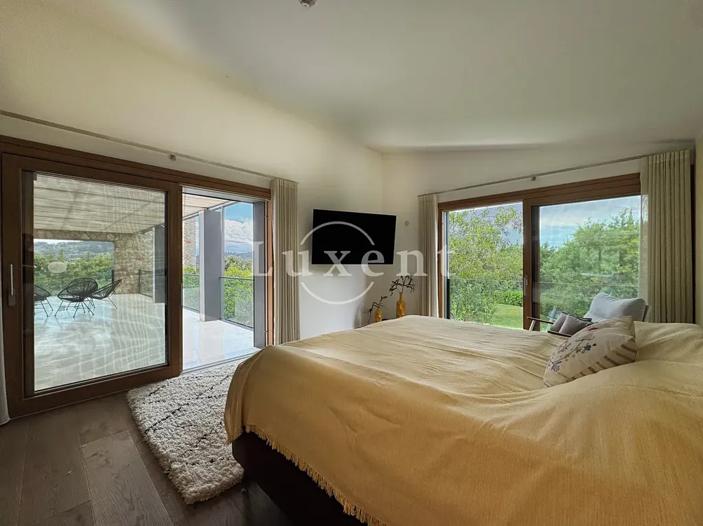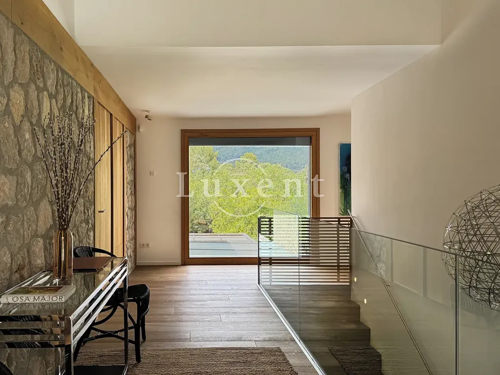 s jídelnou a kuchyní s mini vinotékou. Horní patro zahrnuje hlavní ložnici s vlastní koupelnou a šatnou, další tři ložnice, každá s vlastní koupelnou a vstupem na terasu s překrásnými výhledy na podhoří.