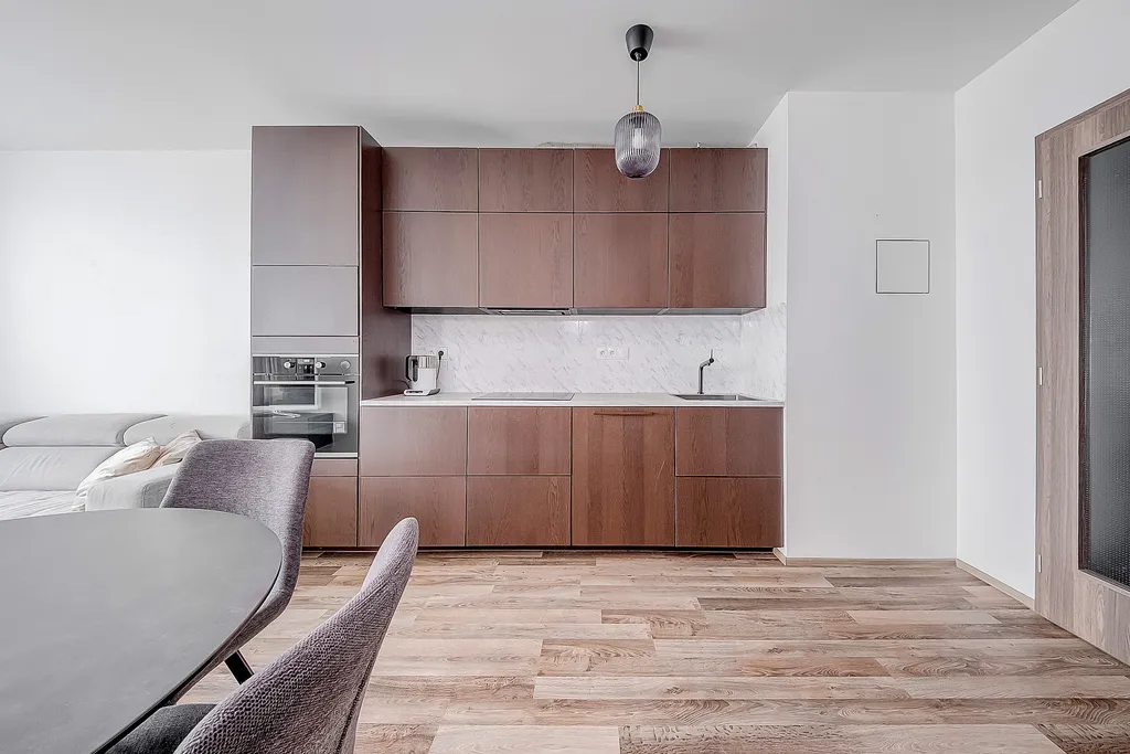 This beautiful apartment is located on the 11th floor of a new building in the sought-after developing area in Prague 3. A limited number of apartments per floor provide a good privacy and tranquility. A parking space for your car is located on the ground floor with easy access, so you don't have to spend time navigating narrow underground passageways. Right next to the parking space you will find a cellar - 4 m² for seasonal items or sports equipment and easy access to the elevator.