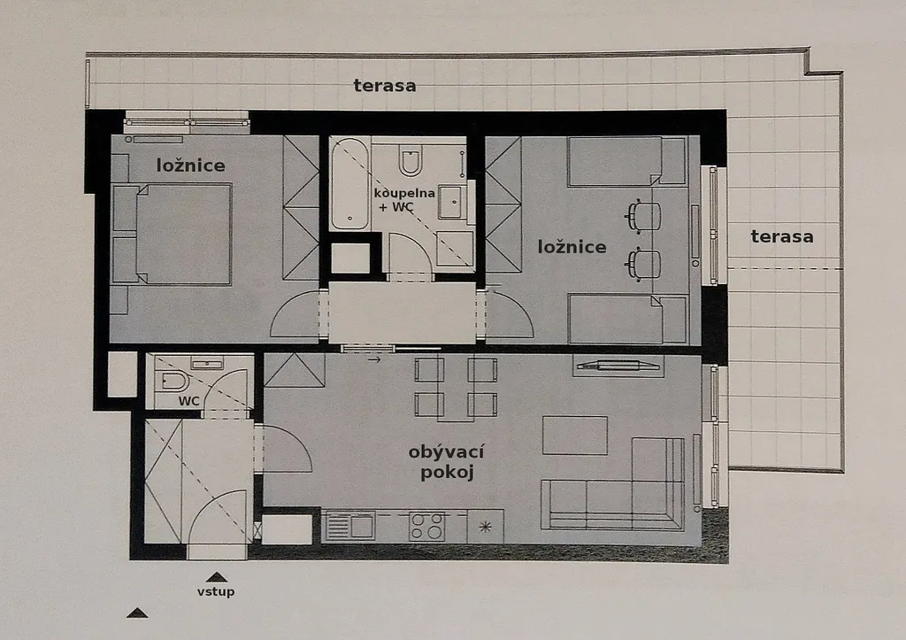 Byt nabízí prostornou obývací místnost, dvě neprůchozí ložnice a 2 x WC. Ložnice jsou oddělené od obývacího pokoje menší chodbou, která ale dává výborné odhlučnění. V koupelně je vana, což přispívá k pocitu komfortu a pohodlí. Samozřejmě dominantou bytu je velká terasa s překrásnými výhledy a přistup na tuto terasu máte z každého pokoje!