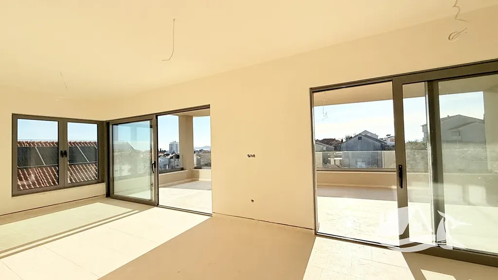 V atraktivní části města Vodice nabízíme komfortní penthouse se třemi ložnicemi, výtahem a dechberoucím výhledem na moře i město. Nemovitost se nachází pouhých 600 metrů od oblíbené městské pláže Plava plaža a přibližně 500 metrů od centra, což znamená, že vše důležité máte na dosah a přesto si užíváte klid rezidenční čtvrti obklopené rodinnými domy.