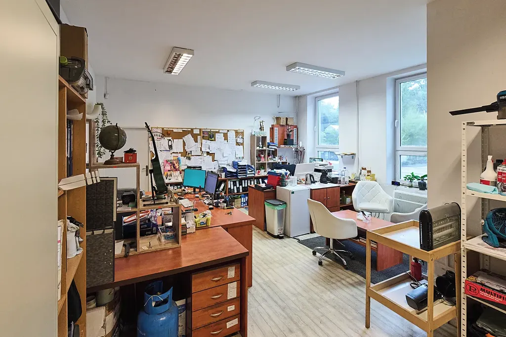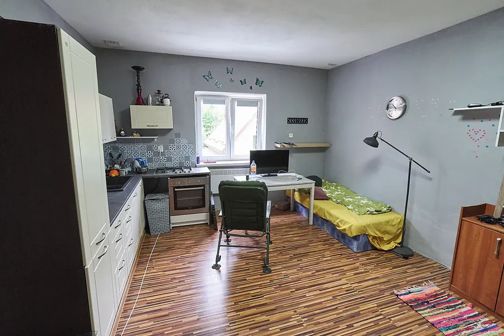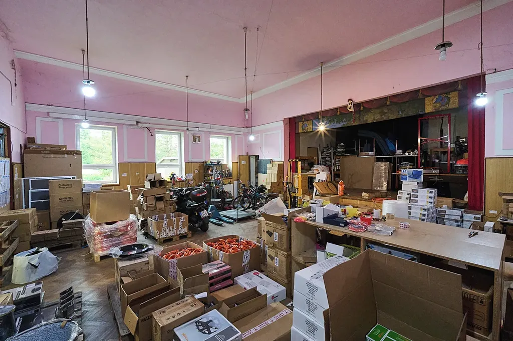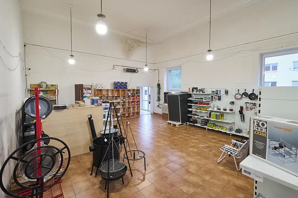 • První podlaží (přízemí): kancelář, skladovací prostory, toalety, sprcha a rozlehlý sál (aktuálně využívaný jako sklad) – celková plocha 356 m²