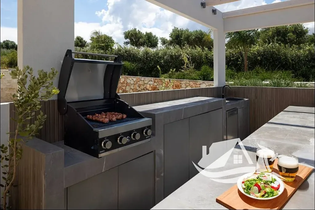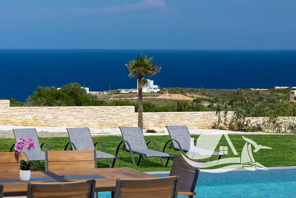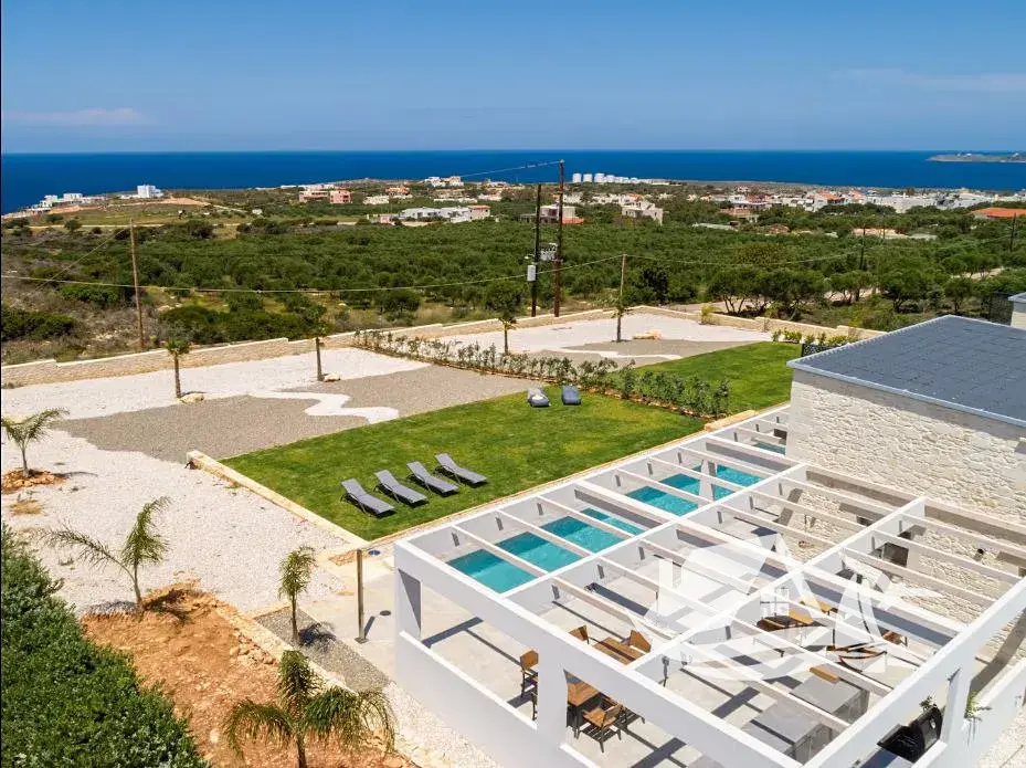 Díky vyvýšené poloze nabízí vila úchvatné panoramatické výhledy na Krétské moře i okolní hory. Dominantou exteriéru je prostorná terasa s privátním infinity bazénem, který opticky splývá s horizontem. Venkovní část je navržena pro pohodlný středomořský životní styl a zahrnuje kryté venkovní posezení, plně vybavenou letní kuchyni s BBQ, dřezem a pracovní plochou, venkovní sprchu a relaxační zónu se slunečníky a lehátky.