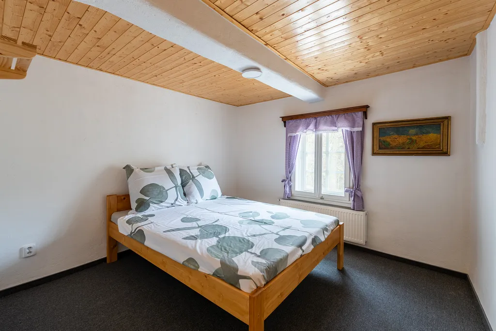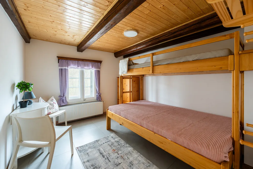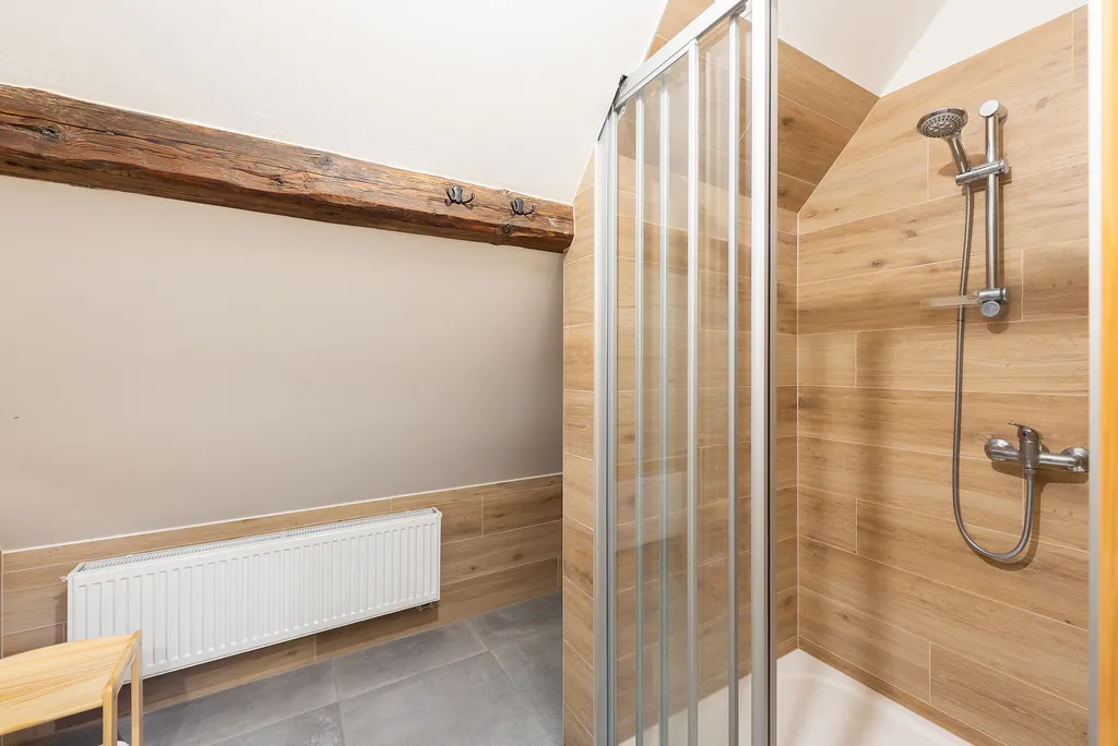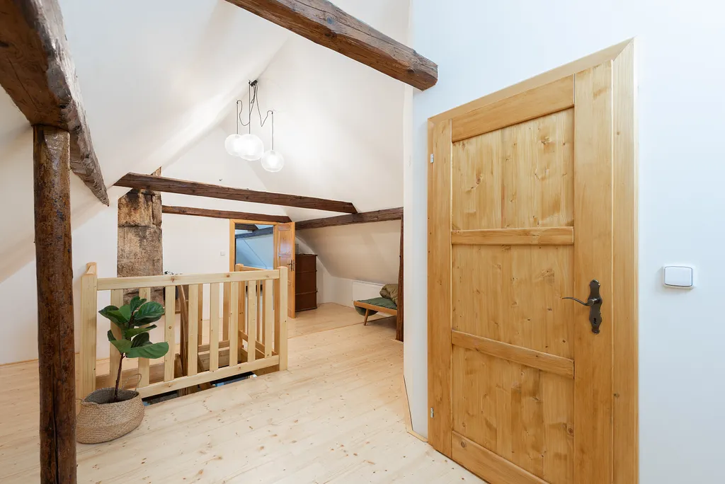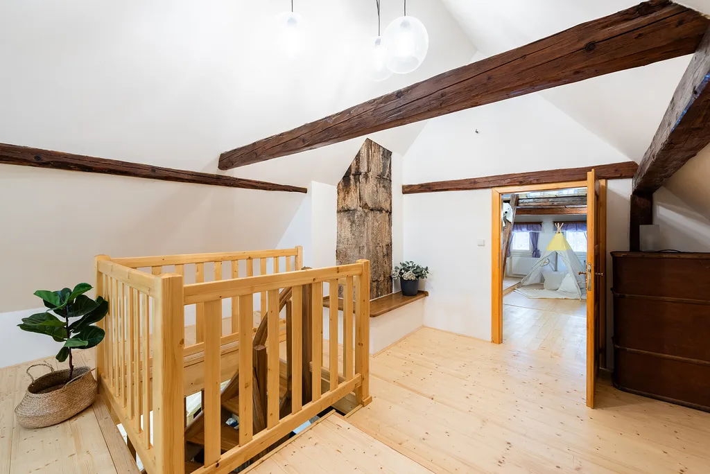 Do podkroví vede masivní dřevěné schodiště, které ústí do prostorné haly s přípravou na druhou kuchyň. Podkroví dále nabízí druhou koupelnu, dvě samostatné ložnice a velkorysý otevřený prostor s přiznanými trámy, který je ideální jako dětský pokoj, herna nebo odpočinková zóna.