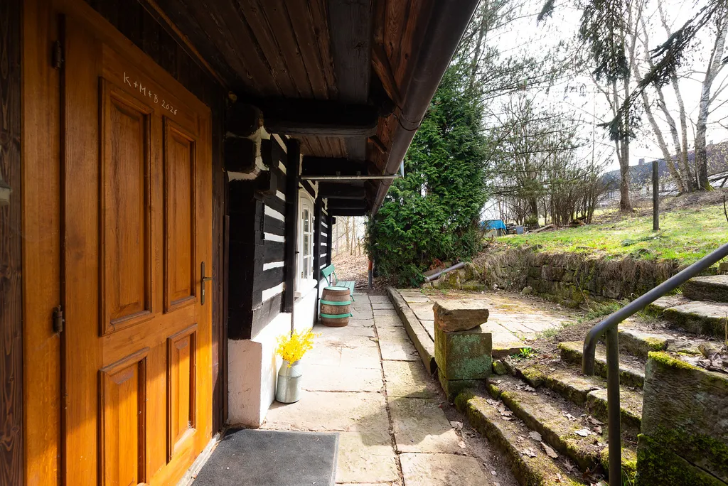 Na dům navazuje mírně svažitá zahrada, kde se nachází původní kamenné zápraží s dlážděným dvorkem a opěrnou kamennou zídkou. Tento prostor vytváří přirozené venkovní posezení a podtrhuje venkovský charakter celé nemovitosti.