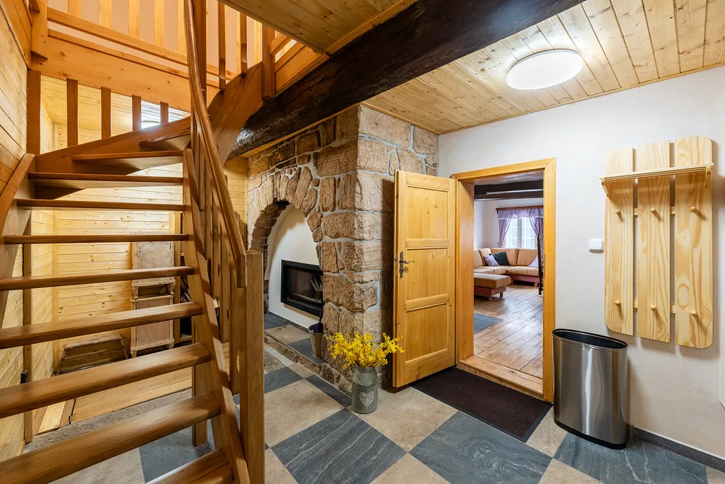 Dominantou domu je renovovaný pískovcový komín s oboustrannou krbovou vložkou, který tvoří přirozené srdce celého prostoru.