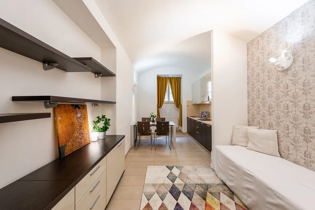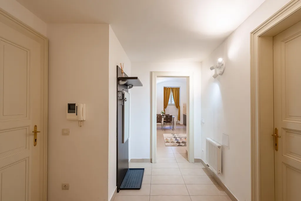 Z kuchyně a obývacího prostoru jsou okna orientována do ulice, ložnice je situována do klidného zeleného vnitrobloku, což zajišťuje příjemné soukromí i přes centrální polohu.
