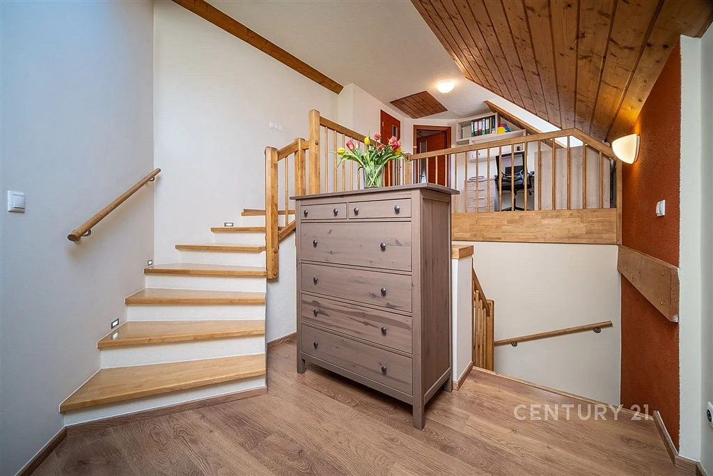 Podkroví je přístupné po krátkém schodišti vedoucím do prostorné haly s pracovnou, která tvoří hlavní komunikační prostor domu. Z haly je vstup do velké ložnice a protilehlého pokoje. Součástí podkroví je také prostorná koupelna vybavená vanou, sprchovým koutem, umyvadlem a toaletou.