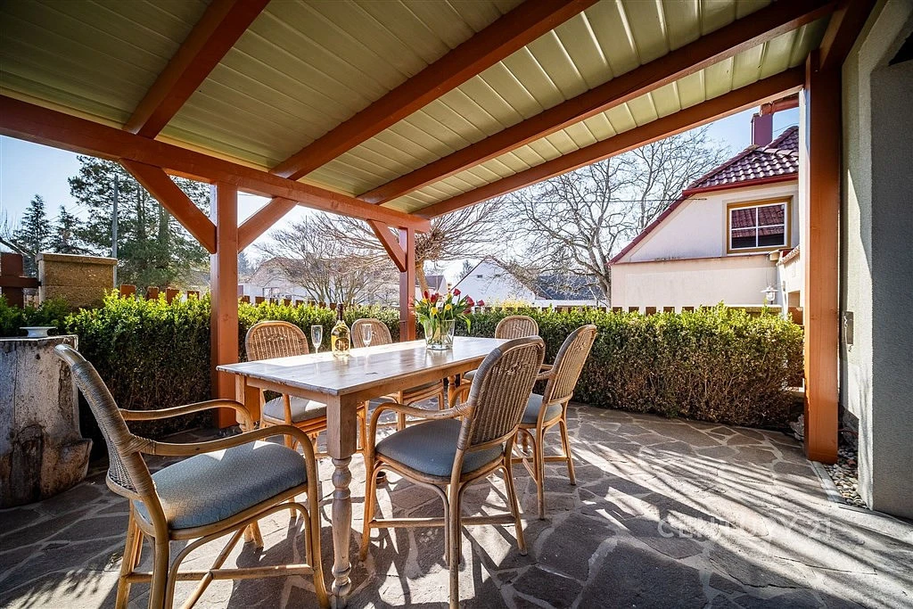 Z obývacího prostoru je přímý vstup na krytou terasu o velikosti cca 16 m², která nabízí ideální místo pro posezení s rodinou či přáteli. Součástí terasy je také venkovní krb.