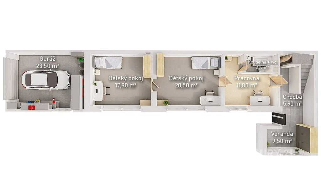 1. NP – pracovna (11,80 m²), koupelna (3,10 m²), dětský pokoj (20,50 m²), dětský pokoj (17,90 m²)
