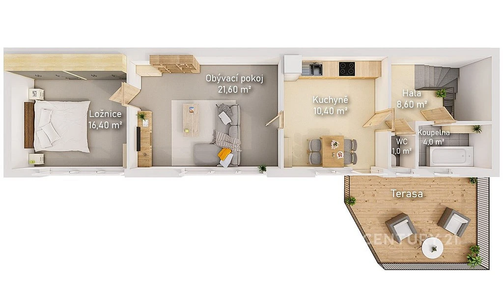 2. NP – kuchyně (10,40 m²) s přímým vstupem na terasu (15,50 m²), obývací pokoj (21,60 m²), ložnice (16,40 m²). Koupelna (4 m²) a WC místnost je přístupna z haly se schodištěm ve 2. NP