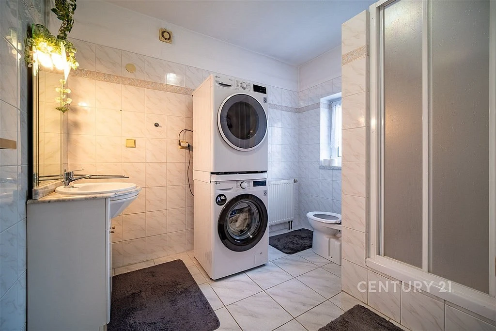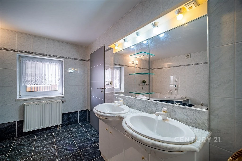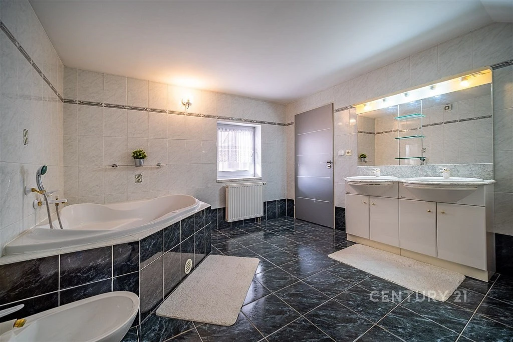 Koupelna v podkroví je vybavena vanou, dvěma umyvadly a toaletou. V přízemní koupelně najdete sprchový kout, toaletu, umyvadlo a přípojku pro pračku.