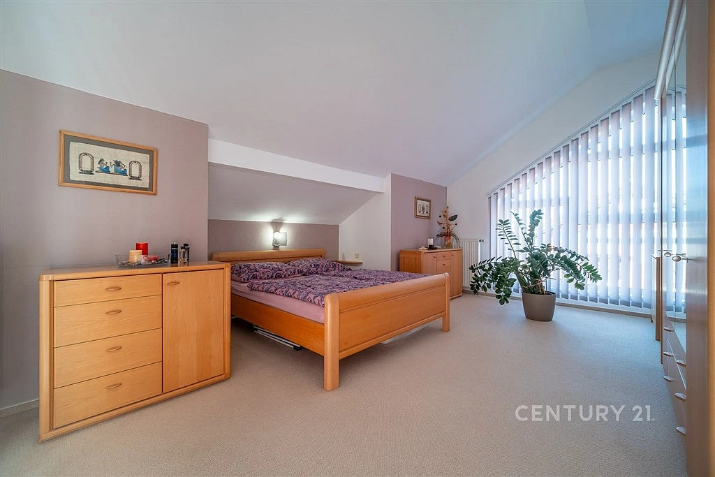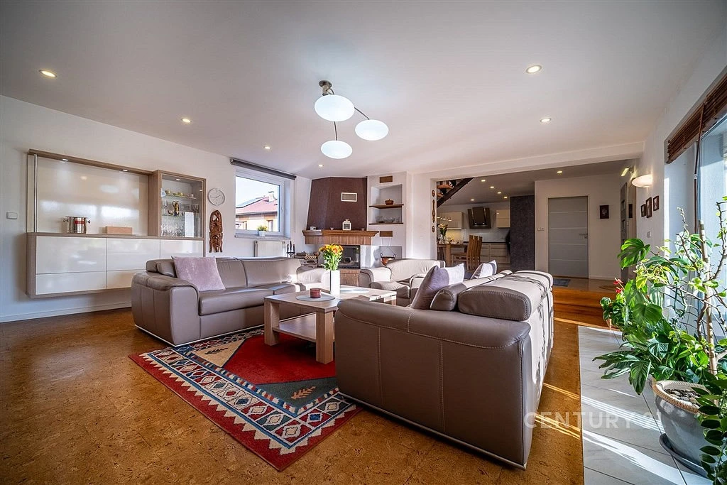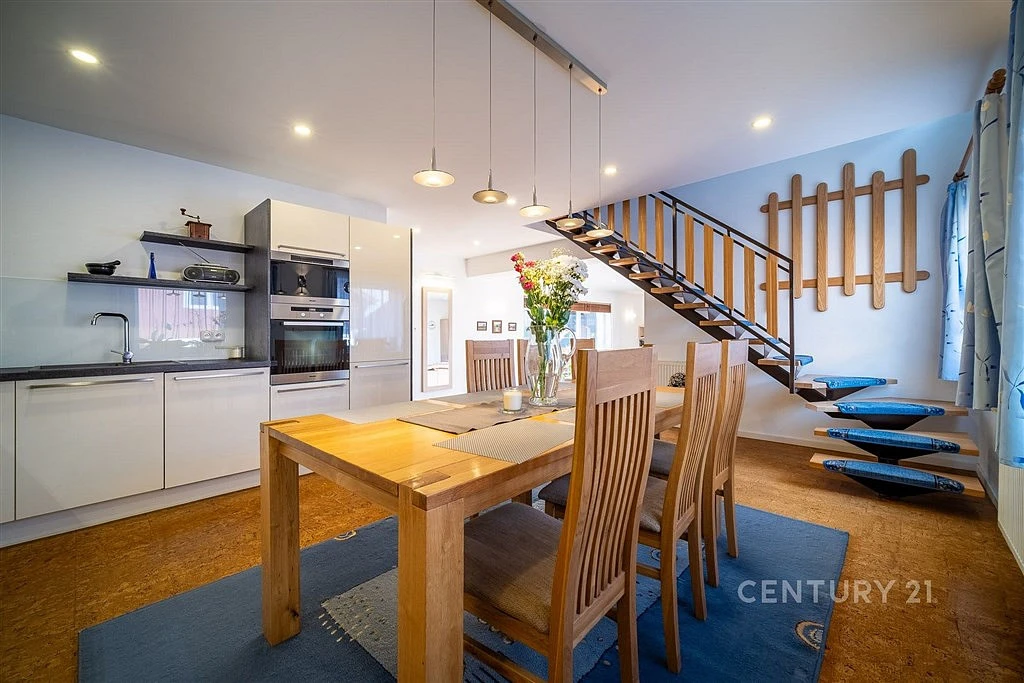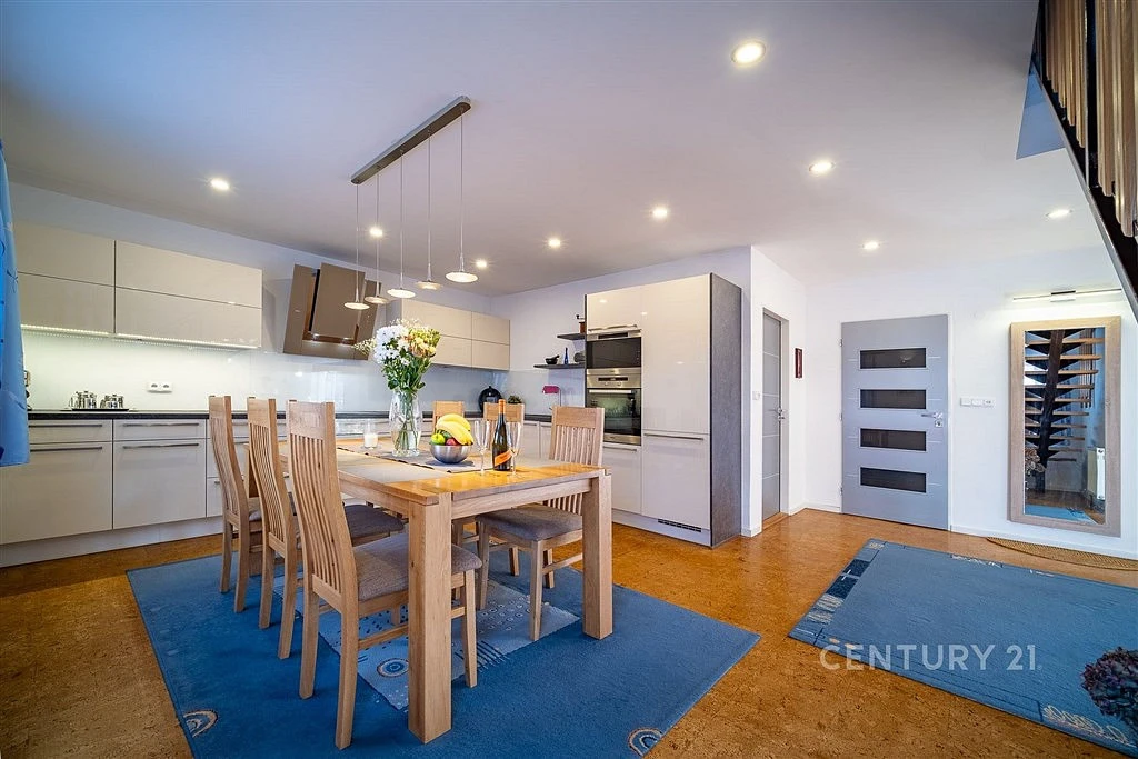 Jedná se o přízemní rodinný dům s obytným podkrovím a technickým suterénem. Dispozičně je dům řešen takto: do domu se vstupuje z kryté terasy do zádveří domu. Prostorné zádveří zajišťuje vstup do koupelny, suterénu a hlavní obytné místnosti, která je tvořena obývací pokojem (39 m²), kuchyní s jídelním koutem (25 m²) a praktickou komorou (6,85 m²). Obývák je prosvětlen velkou okenní sestavou a jeho součástí je krbová vložka. Kuchyně je vybavena moderní kuchyňskou linkou s vestavenými spotřebiči a jídelním stolem pro celou rodinu. Podkroví je přístupné po schodišti a nejdete zde koupelnu, ložnice (25 m²) s přímým vstupem na balkon a velký pokoj (22 m²), který lze rozdělit na dva menší dětské pokoje.