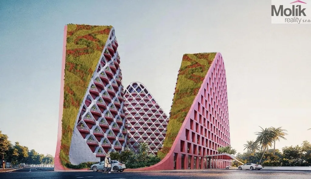 Výšková dominanta: Moderní 16patrová budova s unikátní fasádou pokrytou bujnou vegetací.