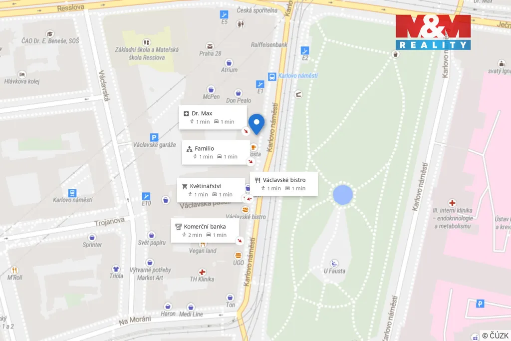 Pracujte tam, kde se potkává energie velkoměsta s prestiží centra Prahy. K pronájmu nabízíme stylovou kancelář „Central Park“ o velikosti 26,3 m², situovanou v 5. nadzemním podlaží udržované budovy v atraktivní lokalitě Nové Město. Tahle kancelář není jen prostor. Je to vibe. Místo, kde se dobře přemýšlí, rozhoduje i uzavírají obchody. Moderní zázemí, výtah i bezbariérový přístup jsou samozřejmostí. Na patře máte k dispozici sdílenou kuchyňku a oddělené toalety – všechno, co potřebujete pro pohodlný pracovní den. A pak je tu něco navíc. Výhledy, které se neomrzí. Karlovo náměstí na jedné straně, Pražský hrad na druhé. Kulisa, která dává vašim schůzkám úplně jiný level. Dostupnost? Bez kompromisů. MHD i autem jste tu vždy včas – a vaši klienti taky. A když je potřeba na chvíli vypnout hlavu?