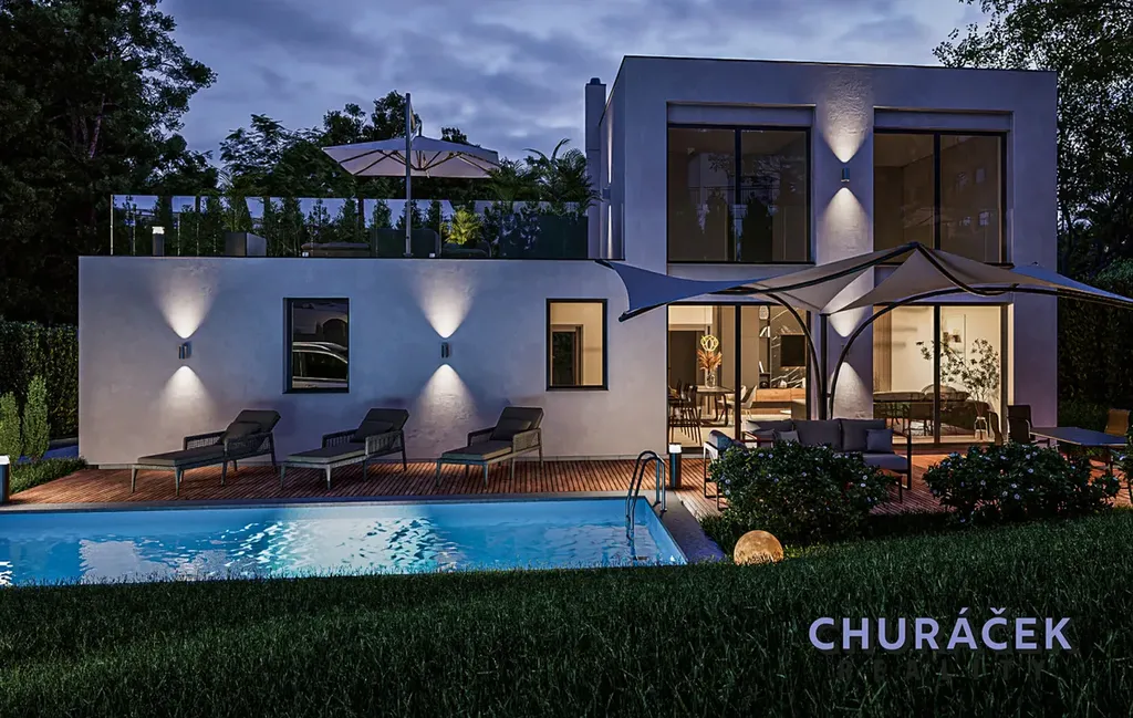 3 koupelny, prostorná garáž pro dvě auta, bazén navazující na terasu z obývacího pokoje, tady Vám opravdu nebude chybět nic.