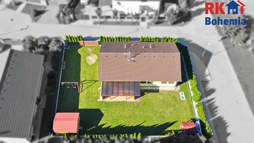 Zahrada je rovinatá a celá oplocená. Nachází se zde terasa, stání na automobil a zahradní domek.