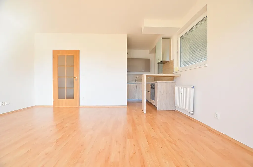 Byt se skládá ze vstupní chodby, koupelny se sprchovým koutem a toaletou, prostorné místnosti s kuchyní a vstupem na balkon s výhledem do parku před domem.