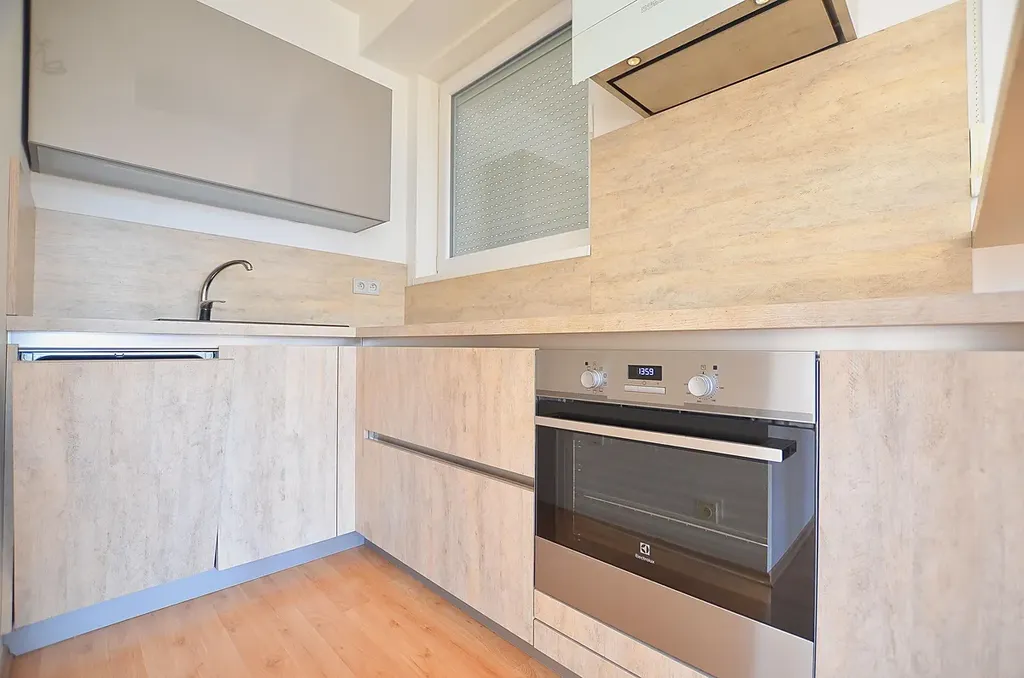 Byt má kompletně vybavenou kuchyň: sklokeramická deska, trouba, digestoř, myčka a úložné prostory, barový (jídelní stůl) stůl.