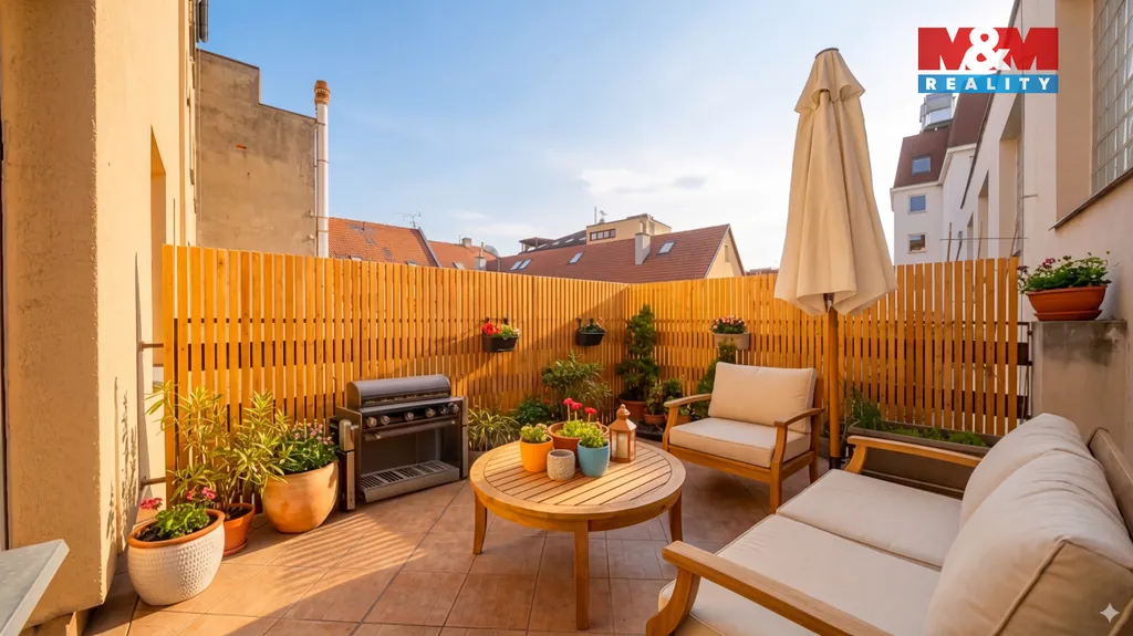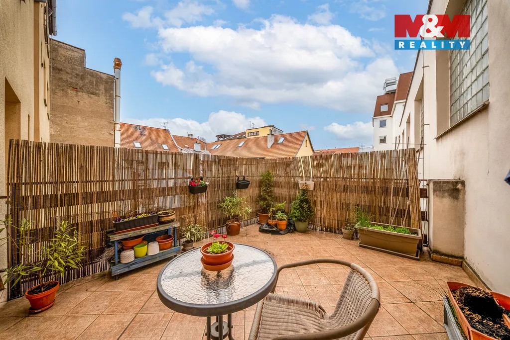 K bytu náleží terasa o velikosti 16,5 m², která je přístupná přímo z obývacího pokoje a je orientována na západ do klidného vnitrobloku. Součástí bytu je také velký sklep o ploše 10 m².