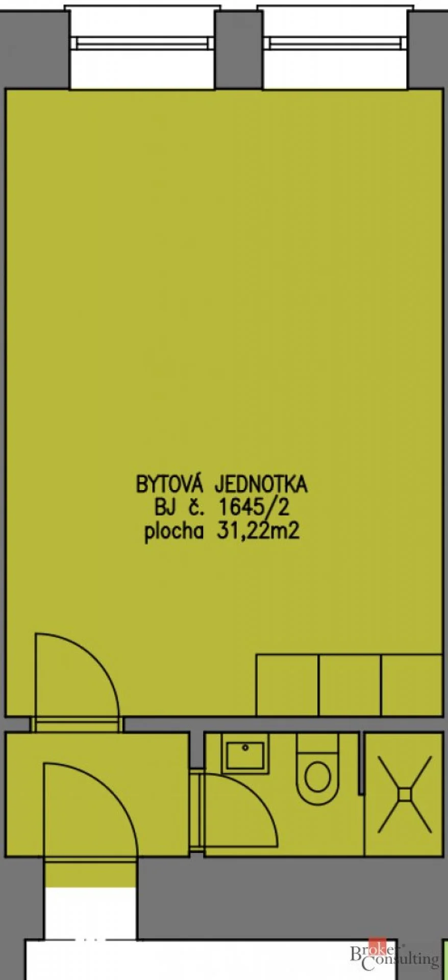 Byt prošel kompletní rekonstrukcí a je v podstatě nový. Celková plocha 31,22 m². Předsíň 2,12 m², koupelna 2,76 m², ateliér 25,53 m².