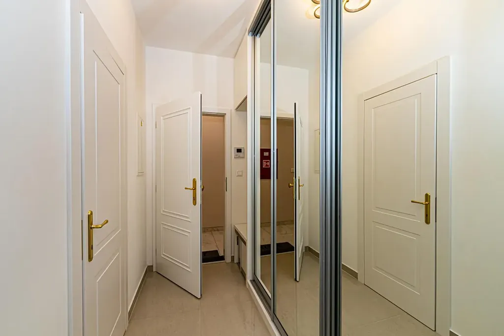 V chodbě jsou prostorné vestavěné skříně se zrcadlovými dveřmi a botník.