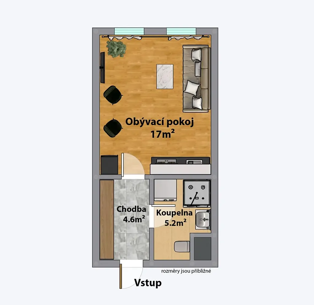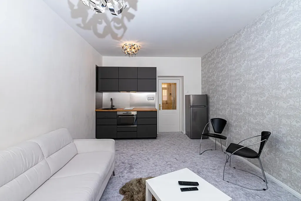 Byt je zařízen. V pokoji je kuchyňská linka s indukční deskou, multifunkční troubou, digestoří a kombinovanou lednicí s mrazákem. Je zde rozkládací pohovka, stolek, TV. Místnost je světlá, se světlým kobercem a velmi jemnou světle šedou textilní tapetou na jedné ze stěn.