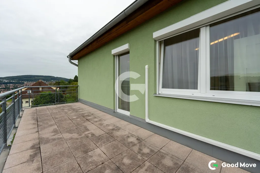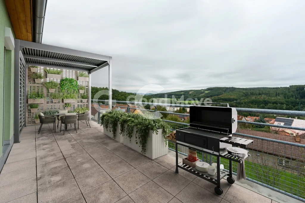 Dominantou bytu je prostorná terasa o velikosti 19 m² s předokenními roletami s elektrickým pohonem značky Somfy. V případě zájmu lze z terasy udělat zimní zahradu a vytvořit tak další plnohodnotný prostor k bydlení. Místo poskytuje jedinečné panoramatické výhledy na okolní zeleň – lesy, golfové hřiště v Kostelci i sportovní areál Vršava. Ideální pro relaxaci, ranní kávu nebo večerní posezení.