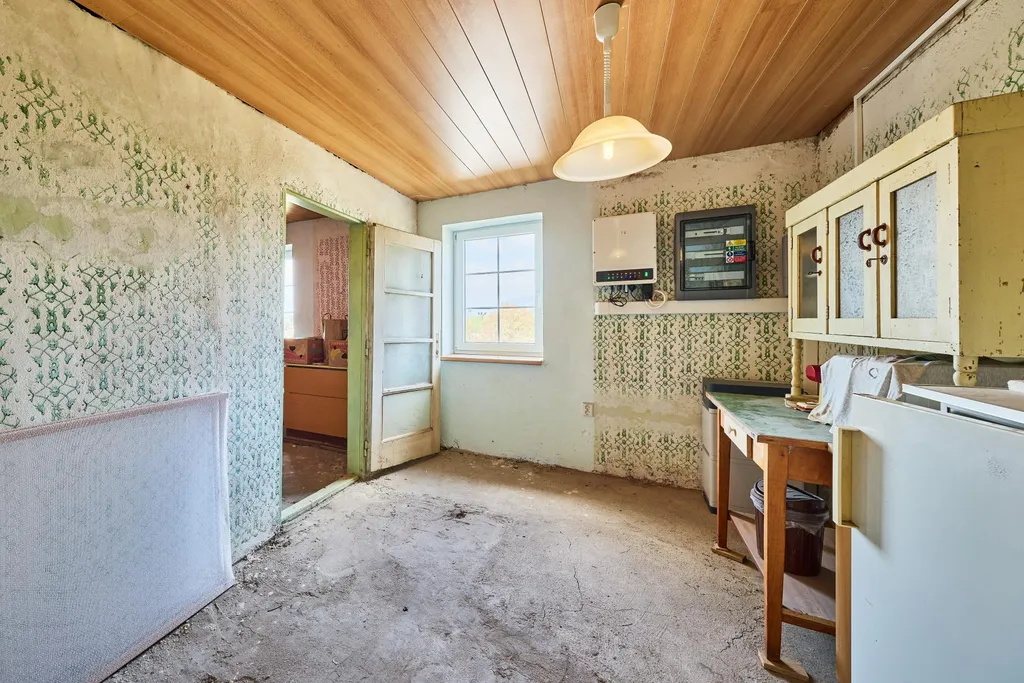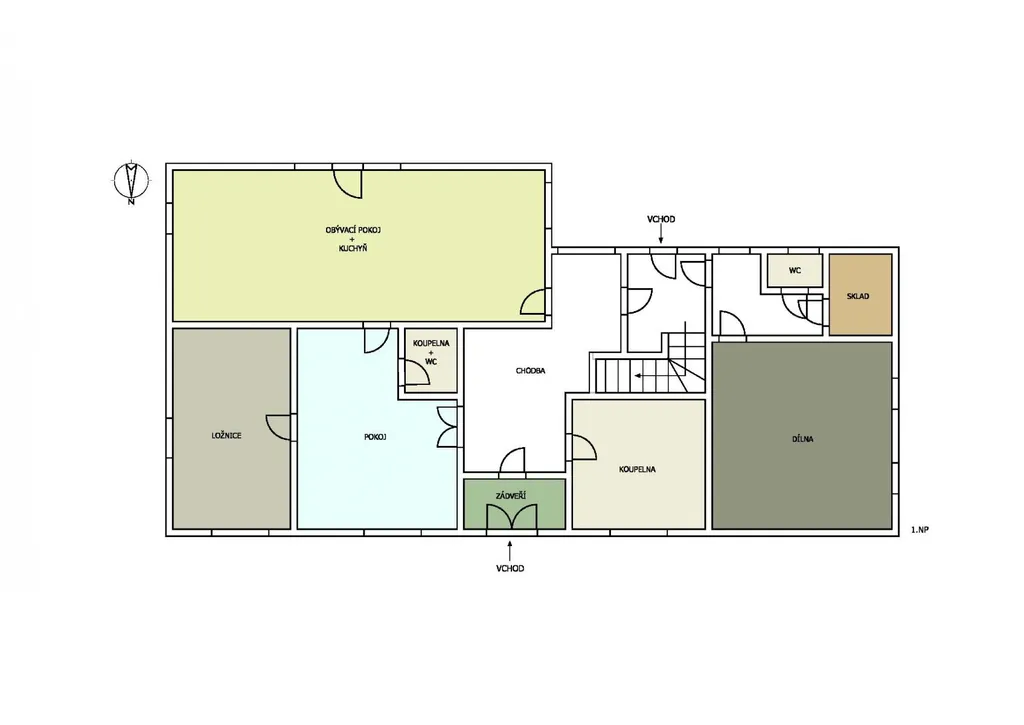 1. NP: zádveří, chodba, velký obývací pokoj se vstupem na terasu a spojený s kuchyňským koutem, pokoj, ložnice, koupelna s vanou a WC, druhá koupelna (ve výstavbě), v druhé části domu - dílna (sklad), technická místnost s WC.