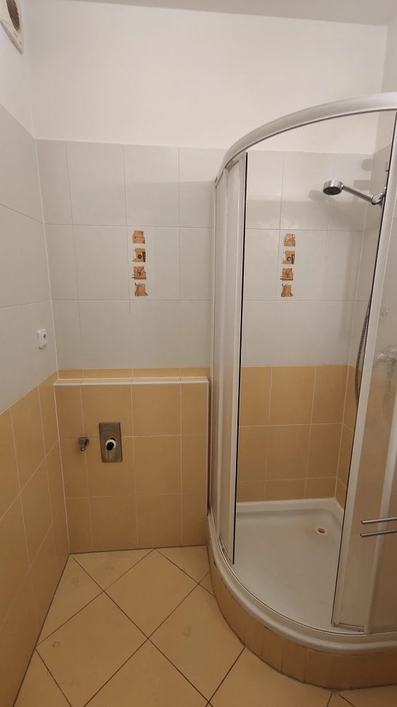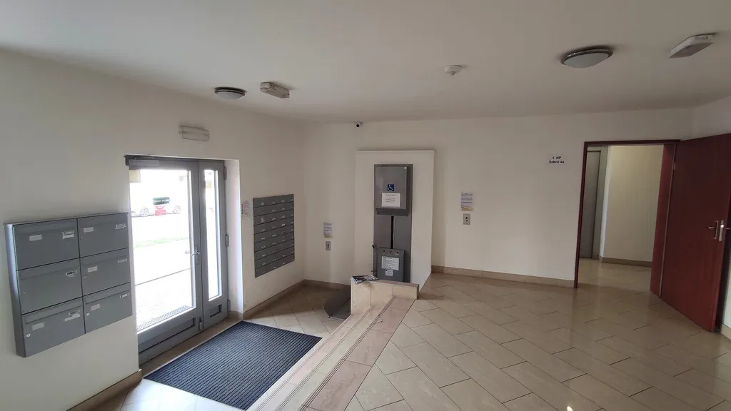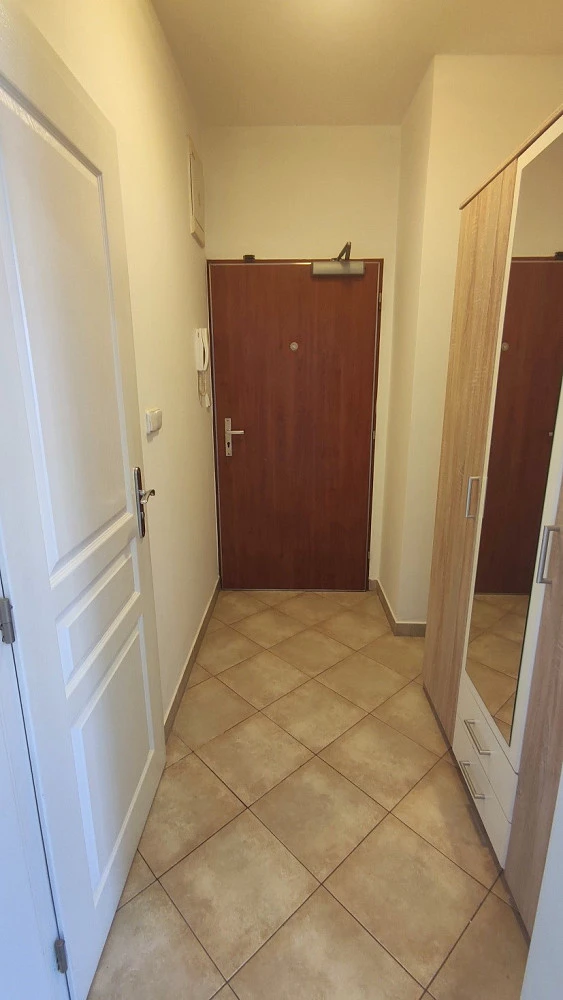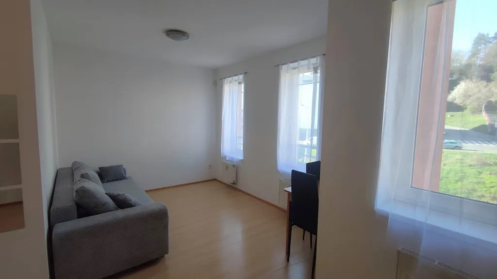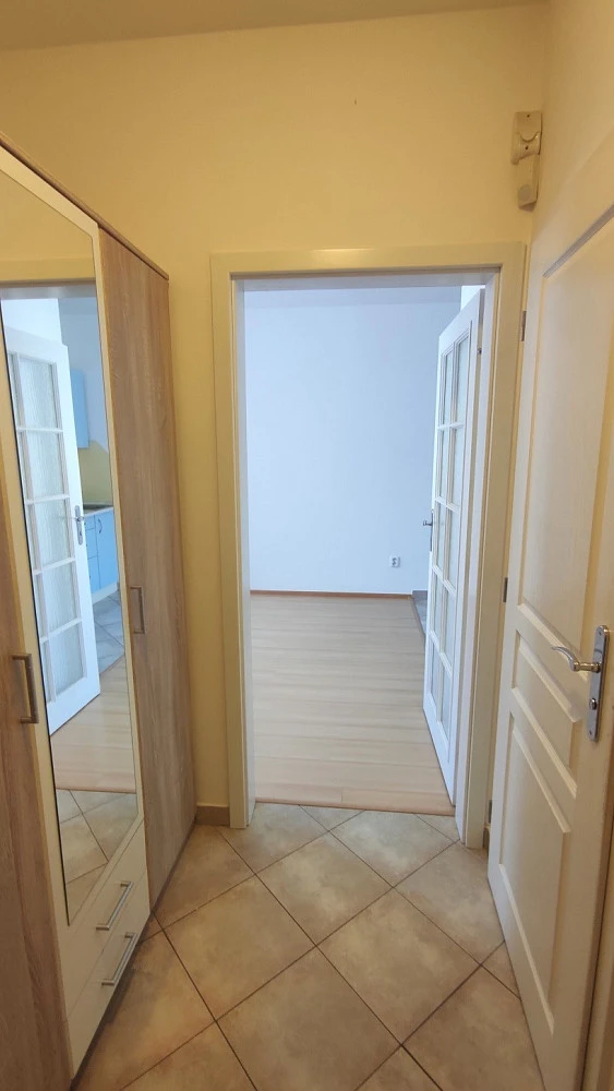 Dispozice bytu nabízí vstupní chodbu se skříní, odkud je přístup do koupelny vybavené sprchovým koutem, umyvadlem a přípravou na pračku, a dále do samostatného WC. Hlavní obytný prostor s kuchyňskou linkou je prakticky členěn na jídelní část a klidovou zónu pro odpočinek.