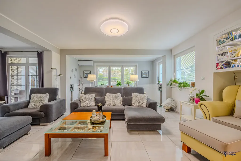 Interiér domu byl navržen s důrazem na kvalitu, prostor a funkčnost. O vytápění domu se stará tepelné čerpadlo značky Nibe, které zajištuje efektivní a úsporný provoz. V horkých letních dnech oceníte klimatizaci. Velkou přidanou hodnotou je instalovaná fotovoltaická elektrárna, díky které jsou měsíční náklady na energie prakticky nulové. Celkové roční náklady na elektřinu za rok 2025 byly 26 tis Kč a celkové příjmy díky smlouvě na fotovoltaickou el. byly 35 tis Kč. S ohřevem teplé vody pomáhají solární kolektory.