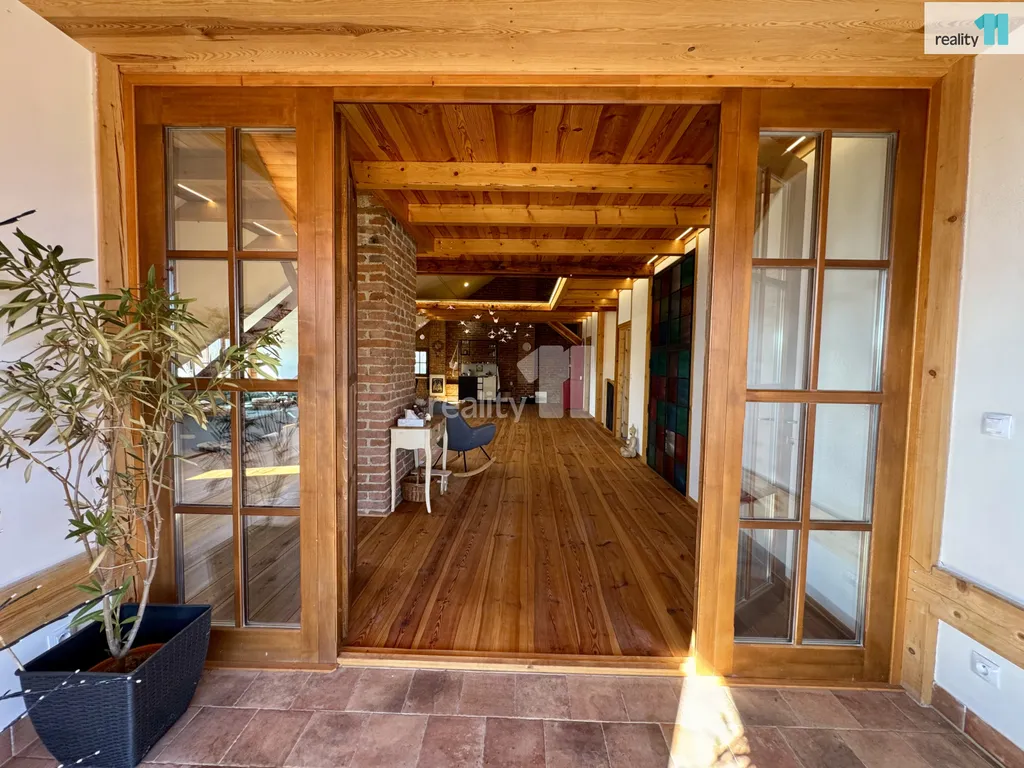 V horním patře je podkrovní byt 3+kk o ploše 180 m² s terasou a výhledem na tvrz. Vhodný pro vlastní bydlení, dlouhodobý pronájem i rozšíření ubytování.