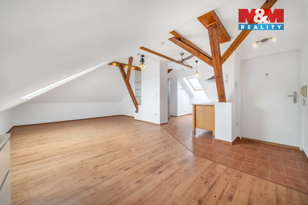 Prodej prostorného podkrovního bytu 1+kk o celkové ploše 55 m² v osobním vlastnictví, situovaný ve 3. patře cihlového domu bez výtahu v klidné části Mníšku pod Brdy, ul. 5. května. Byt vznikl jako půdní vestavba a nabízí otevřený obytný prostor o velikosti 42,39 m² a nadstandardně velkou koupelnu (13,11 m²).