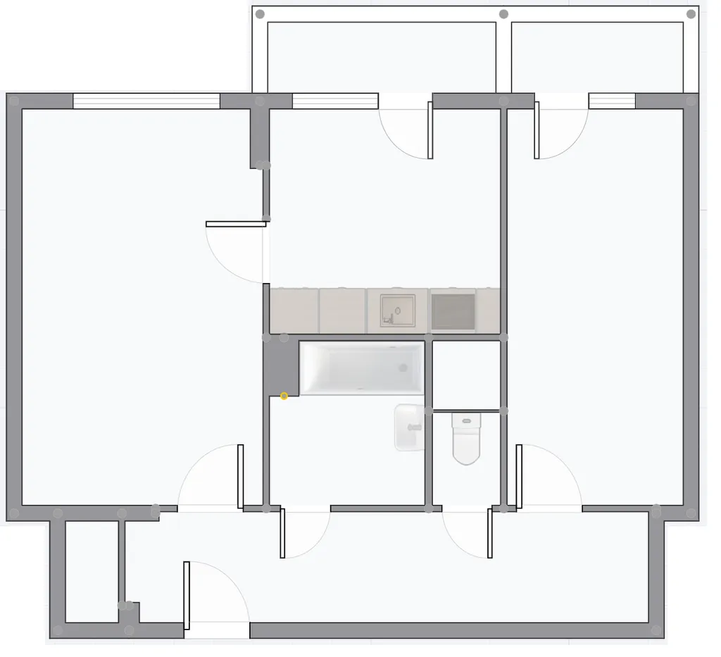 Dispozice bytu nabízí praktické a vzdušné řešení: prostorná předsíň s přístupem do samostatné komory, obývací pokoj průchozí do čtvercové kuchyně se vstupem na první balkon, neprůchozí ložnice se vstupem na druhý balkon. Koupelna je prostorná, vybavená vanou a místem pro pračku. K bytu náleží také sklepní kóje.