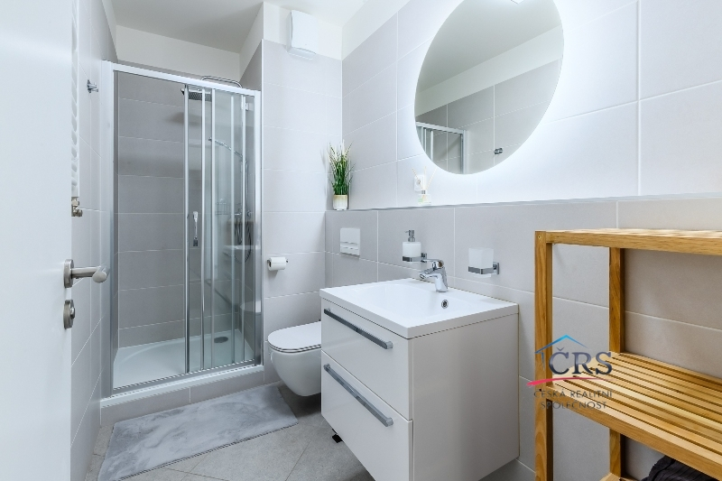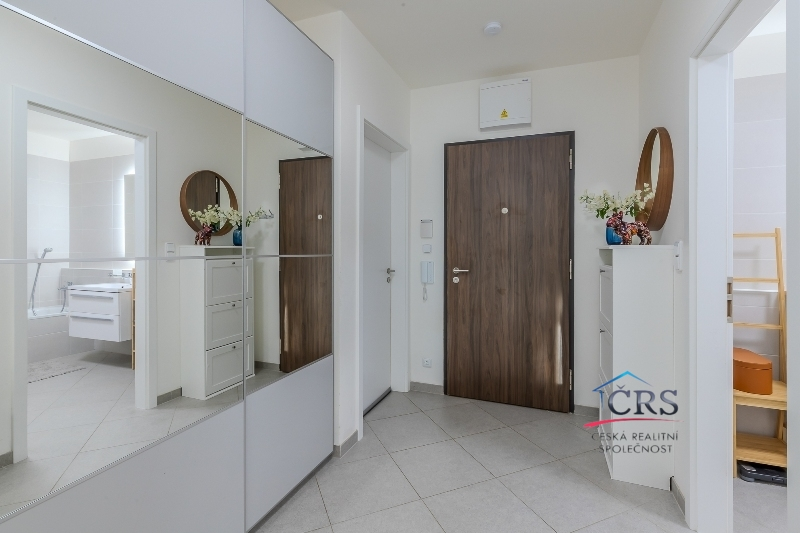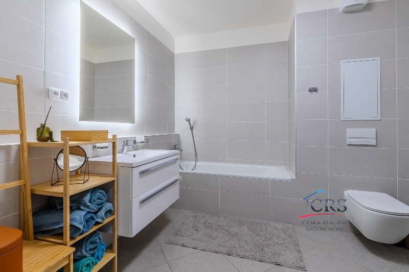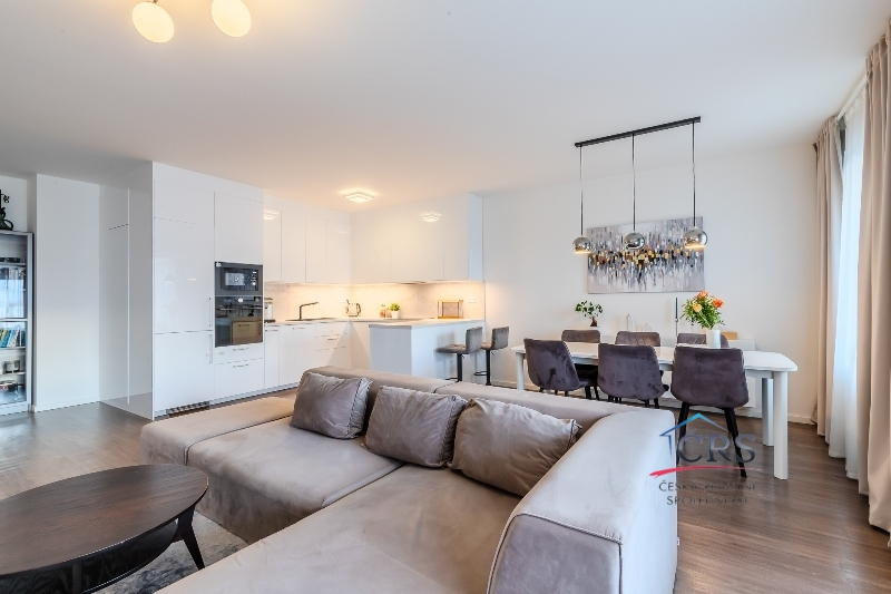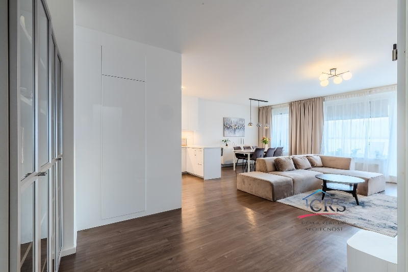 Dispozice bytu nabízí praktické a komfortní bydlení – všechny pokoje jsou neprůchozí, což zajišťuje maximální soukromí, dvě koupelny. Prostorný obývací pokoj s kuchyňským koutem o výměře 43,5 m2 ( kuch. linka s vestavěnými spotřebiči) . Jedna ložnice má svoji koupelnu se sprchovým koutem a WC dohromady, dále prostornou šatnu a balkón. V druhé koupelně je vana a WC. Na podlaze dlažba a vinyl, na stěnách štuky. Byt je vybaven klimatizací v obývacím pokoji pro pohodlí v letních měsících a zabezpečovacím systémem Jablotron.