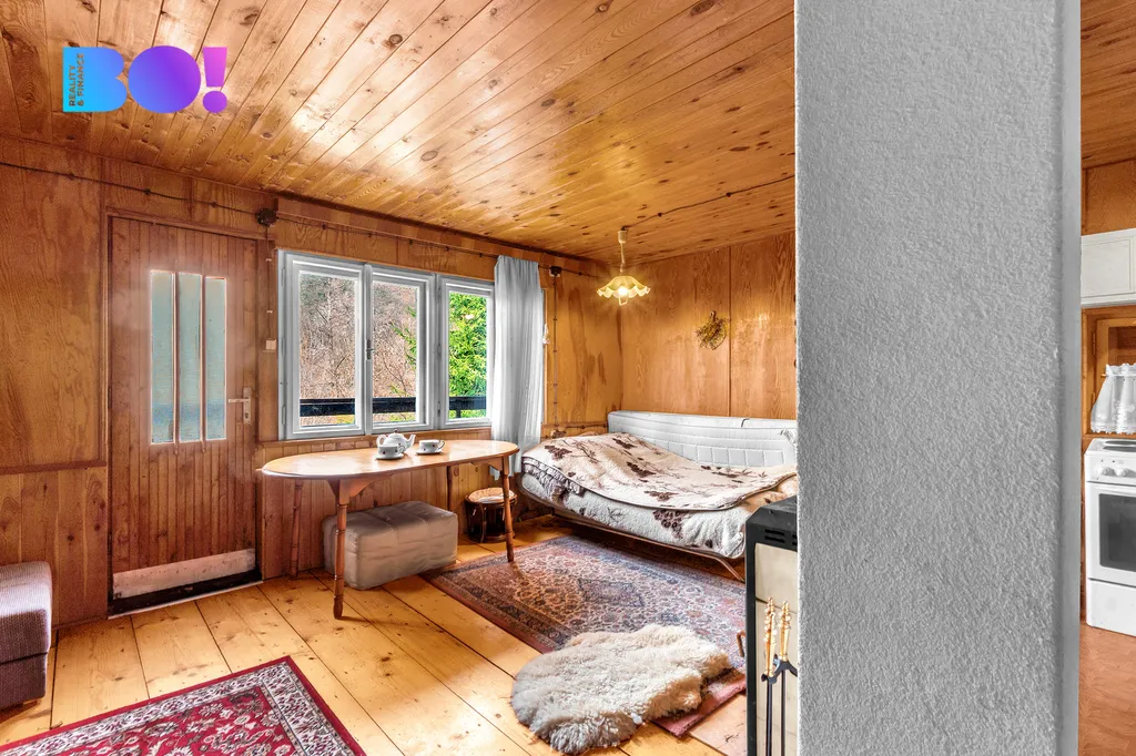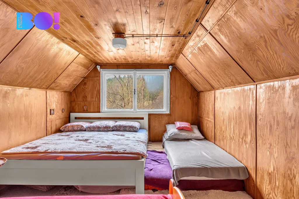 • Dispozice: 1.NP - vstup z prostorné verandy do hlavní obytné místnosti s balkonem a kuchyňským koutem, koupelna se sprchovým koutem, WC, schody do podkroví. 2 NP. ložnice v podkroví. Chata je podsklepená.