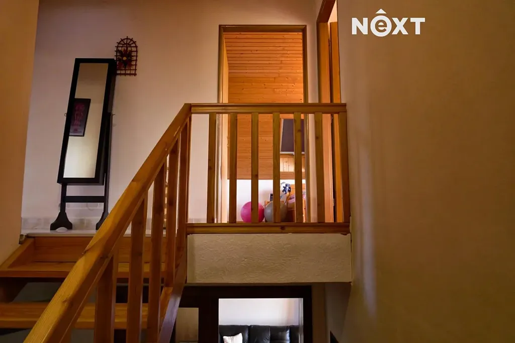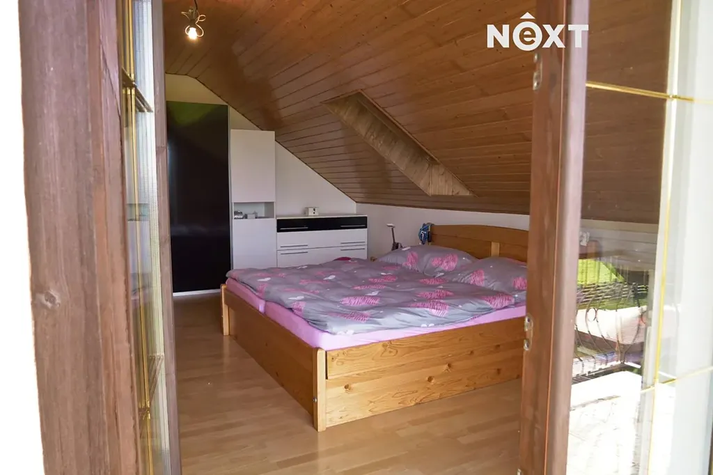 Podkroví: dřevěné schodiště s chodbou kterou se vstupuje do jednotlivých pokojů – ložnice s balkonem cca 23 m2 a dvou dětských pokojů cca 18 m2 a 21 m2, dále prostorná koupelna s WC, rohovou vanou a umyvadlem, je zde volný prostor třeba pro domácí saunu.