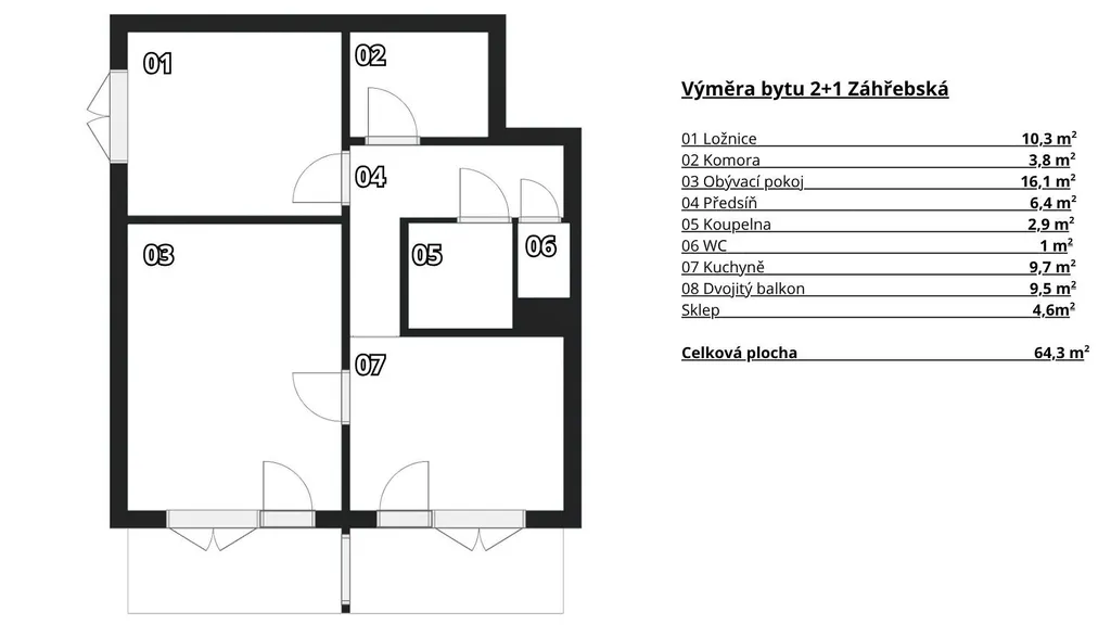 Dobře dispozičně řešený byt se samostatnýmí vstupy do pokojů, je situován ve 2n. p. a má celkovou užitnou plochu 64,3m², vč. 2 balkonů a prostorného sklepa. Vzhledem ke stavebnímu propojení balkonů, vznikl venkovní prostor odpovídající terase. Z balkonu je pozitivní výhled do zeleně. Pro lepší představu o dispozici je součástí prezentace půdorys bytu a 3D vizualizace.