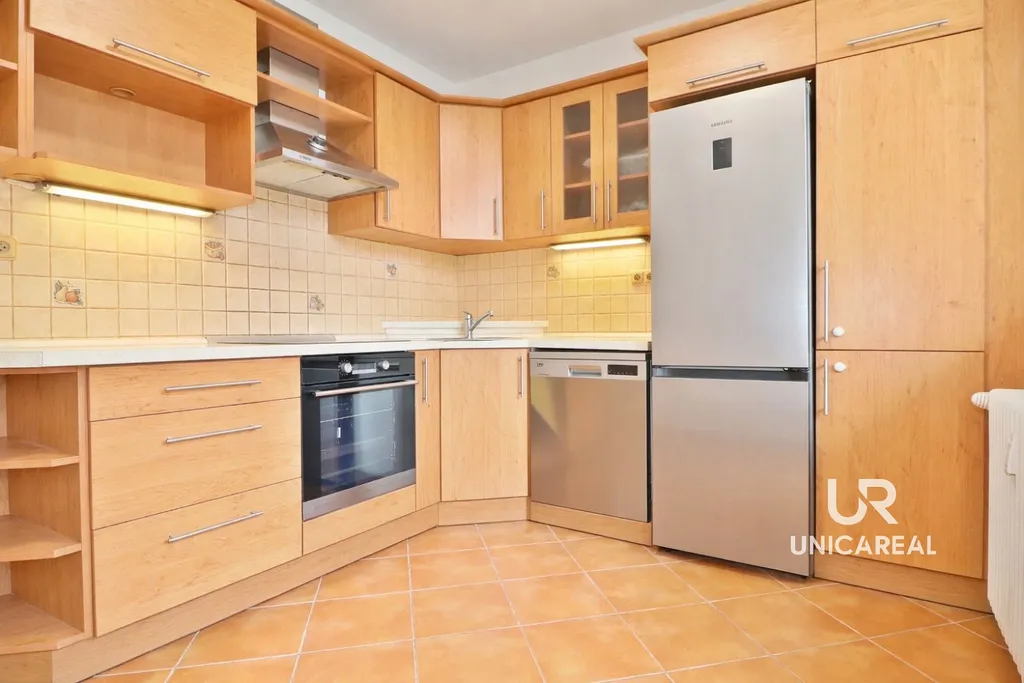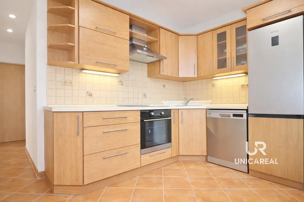Byt je vybaven kuch. linkou, vestavěnou sklokeramickou deskou a elektrickou troubou, velkou lednicí s mrazničkou, vestavěnou myčkou, digestoři a příslušenstvím koupelny a WC. V koupelně je přípojka na pračku. Po domluvě s pronajímateli je možné byt dovybavit pračkou. Velkou výhodou z hlediska úložného prostoru, je praktická šatna.