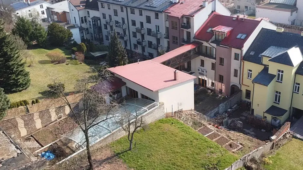 Dvorní objekt a propojení: Z mezonetového bytu v hlavní budově vede krytá propojovací lávka do samostatného objektu ve vnitrobloku. Tato stavba je zasazena do svažitého terénu a sestává ze čtyř podlaží: