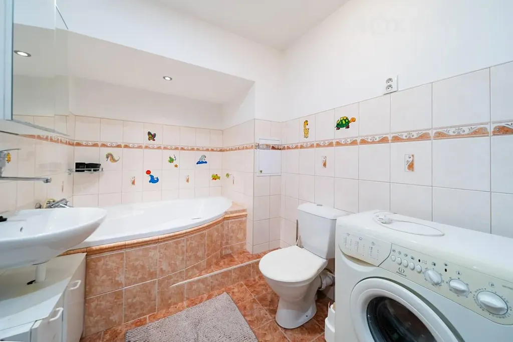 Velkou výhodou je koupelna vybavená vanou i sprchovým koutem. Byt se pronajímá kompletně zařízený dle fotografií – k dispozici je lednice, myčka, pračka i vestavěné skříně, takže stačí jen přinést osobní věci a můžete bydlet.