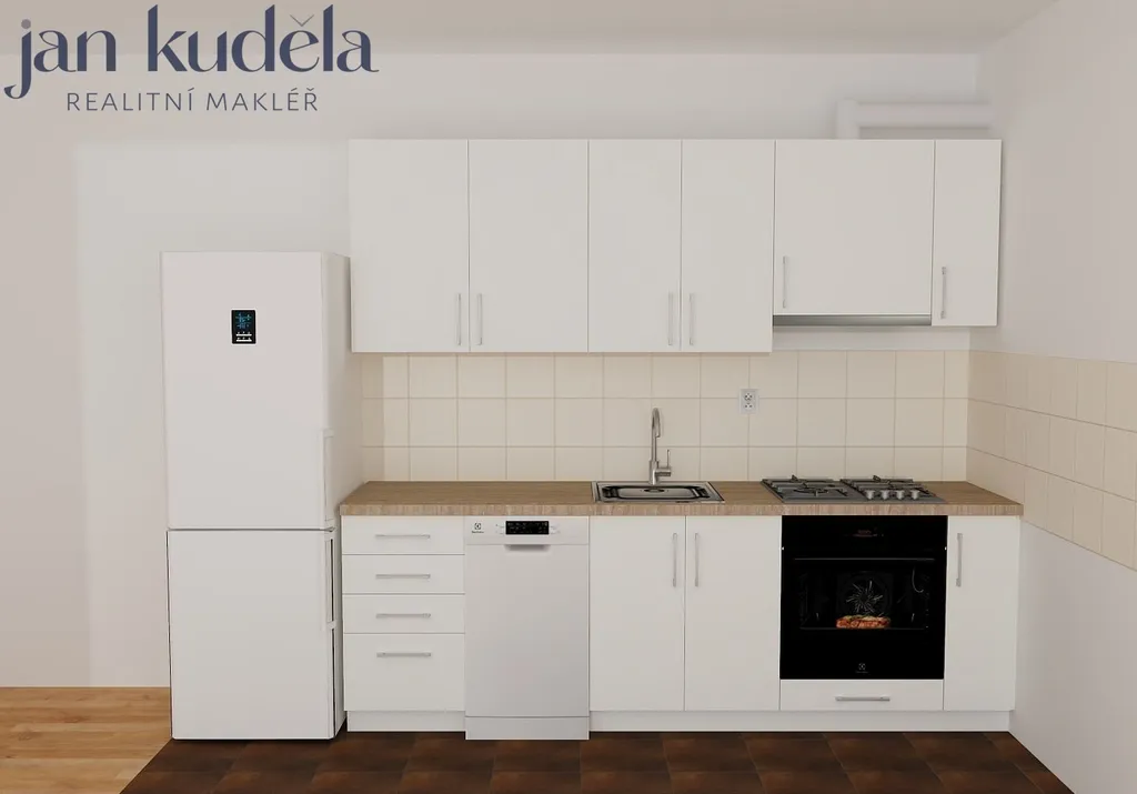 Dispozice bytu je velmi dobře řešená. Po vstupu se nacházíte v chodbě se vstupem do samostatné šatny o velikosti 2,6 m². Z chodby je dále přístup do ložnice o výměře 10 m², do koupelny s vanou a plynovým kotlem pro celý byt, na oddělenou toaletu a do obývacího pokoje s kuchyňským koutem. Obývací pokoj s kuchyní má plochu 21,66 m² a poskytuje dostatek prostoru pro kuchyňskou linku, jídelní kout i obývací část. Kuchyňská linka je dodělána dle připravené vizualizace. Vybavení bude trouba, myčka, plynový sporák a po dohodě lednice.