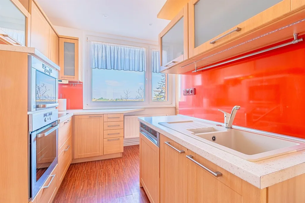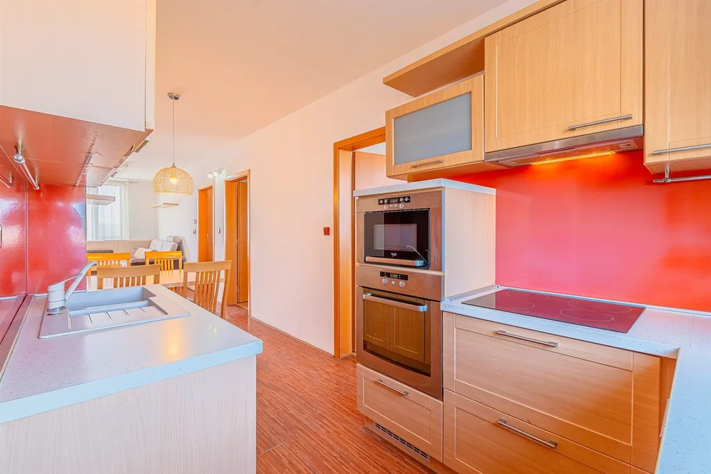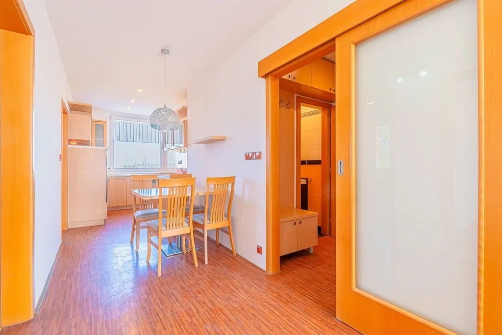 Dispozice: vstup se zádvěřím a vestavěnou skříní samostatné WC s umyvátkem obývací pokoj ložnice s velkou vestavěnou šatní skříní a výstupem na lodžii další pokoj (menší) čtvrtý pokoj průchozí kuchyně koupelna s vanou. Dále k bytu náleží komora v mezipatře, kde je i umístěný plynový kotel se zásobníkem.