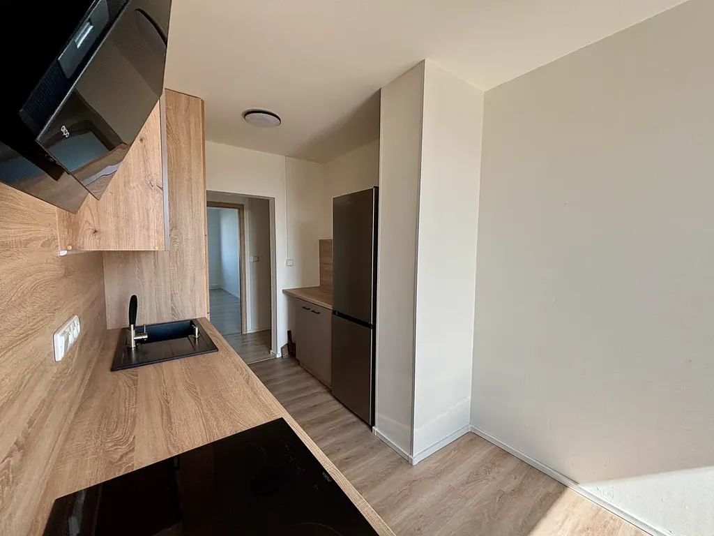 Vše v novém – zcela nová kuchyňská linka disponuje novými spotřebiči (sklokeramická varná deska, el.trouba, odsavač par, myčka nádobí, lednice s mrazákem). V moderní koupelně je sprchový kout a pračka, WC odděleně.