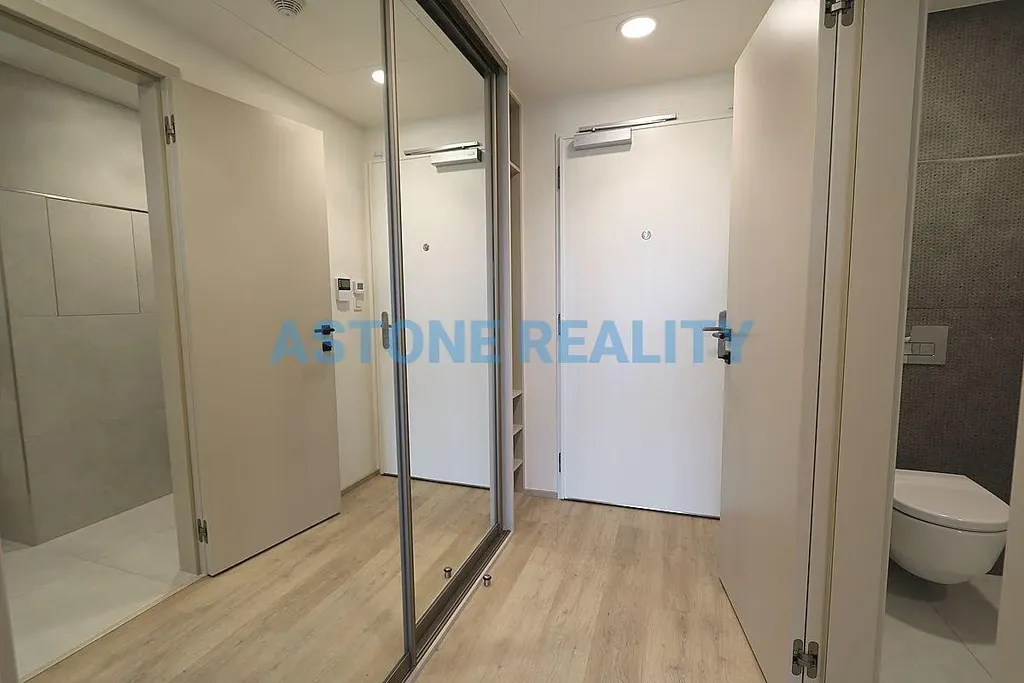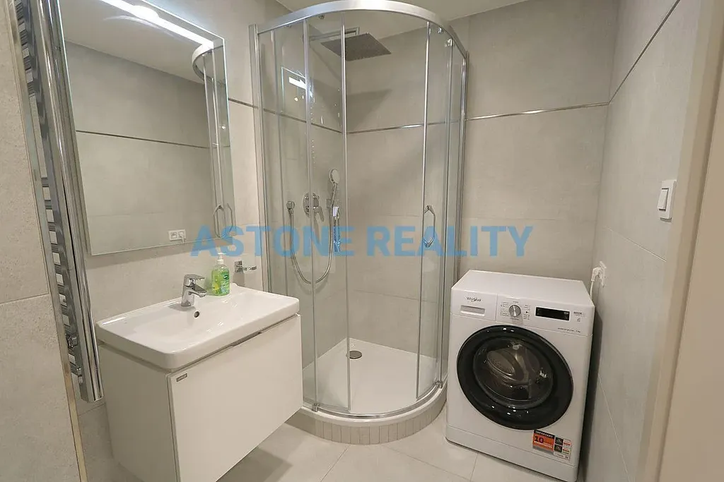 Exkluzivně Vám nabízíme k pronájmu luxusní byt s klimatizací s dispozicí 1+kk s balkonem a s garážovým stáním v nové rezidenci Parková čtvrť v Praze 3, Žižkov, v ulici Šrámkové. Prostorný byt o velikosti 34 m2 a s balkonem 9 m2 se nachází v pátém nadzemním podlaží budovy se dvěma výtahy. Je nabízen částečně zařízený, kvalitní, nová kuchyňská linka je vybavena všemi vestavěnými spotřebiči zn. Electrolux včetně myčky, v koupelně se nachází sprchový kout, toaleta a pračka, v předsíni velké zrcadlové vestavěné šatní skříně. Bezpečnostní hliníková francouzská okna s elektrickými venkovními žaluziemi na dálkové ovládání směřují na jih do udržovaného vnitrobloku se zelení. Kvalitní vinylové podlahy v kombinaci s dlažbou, bezpečnostní vstupní dveře. Podlahové vytápění, řízená rekuperace, datové optické rozvody pro vysokorychlostní internet. V celém bytě úsporné LED osvětlení. K bytu náleží garážové stání za 1.500,- Kč měsíčně /nutno pronajmout/. Vstup do všech prostor domu na čip, kamerové systémy. Skvělá dopravní dostupnost do centra, pěší chůzí 5 min na metro nebo tramvají na metro A Želivského. V okolí veškerá občanská vybavenost, škola, školka, relaxační a sportovní centrum Olšanka, poliklinika. Majitel preferuje nájemce bez zvířat, nekuřáky. K dispozici od 31.5., neplatíte provizi RK.