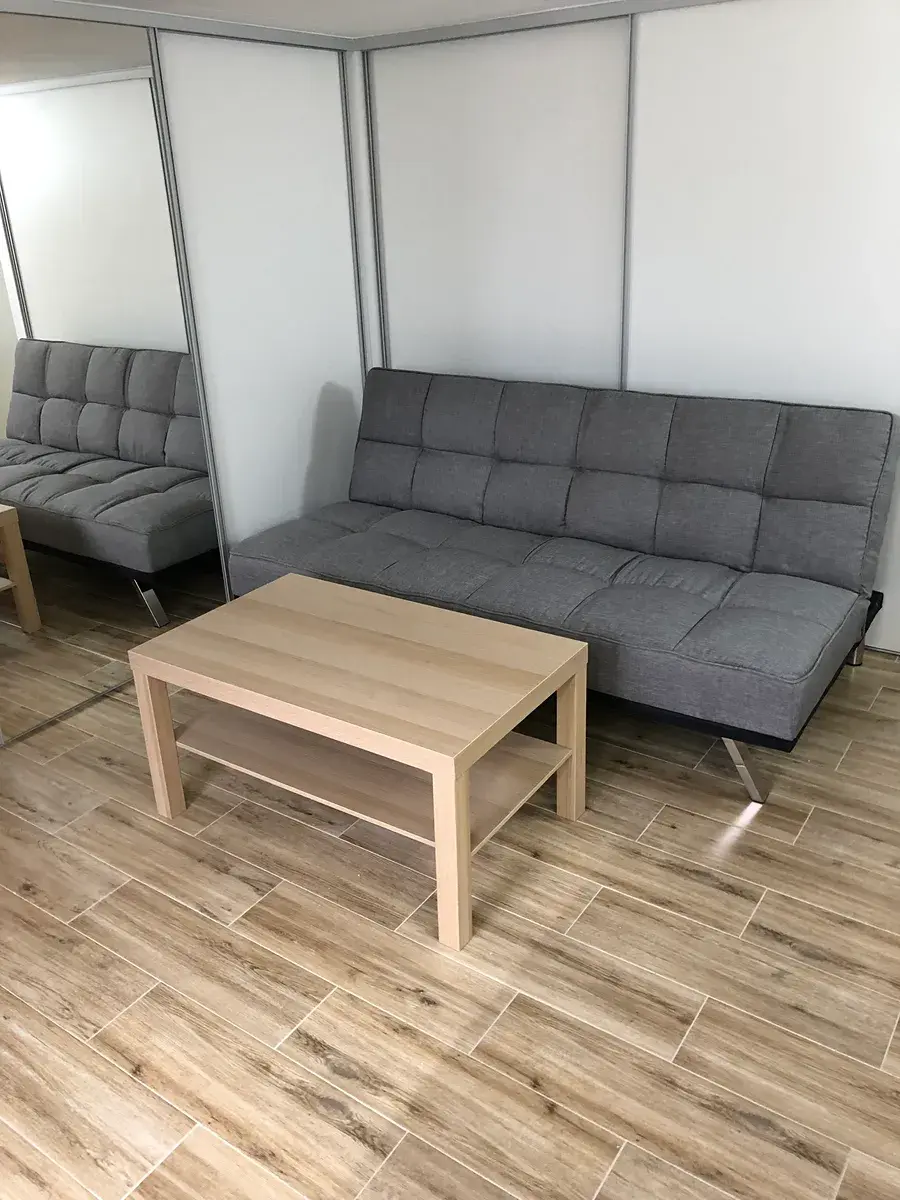 Dispozice a vybavení bytu: Kuchyňský kout se spotřebiči (velká lednice s mrazákem, varná deska, mikrovlnná trouba), dále pohovka, stůl + 2 židle, skříň. V ložnici manželská postel s kvalitní matrací, přikrývkami, polštáři a povlečením. Koupelna se sprchovým koutem, pračkou a wc.