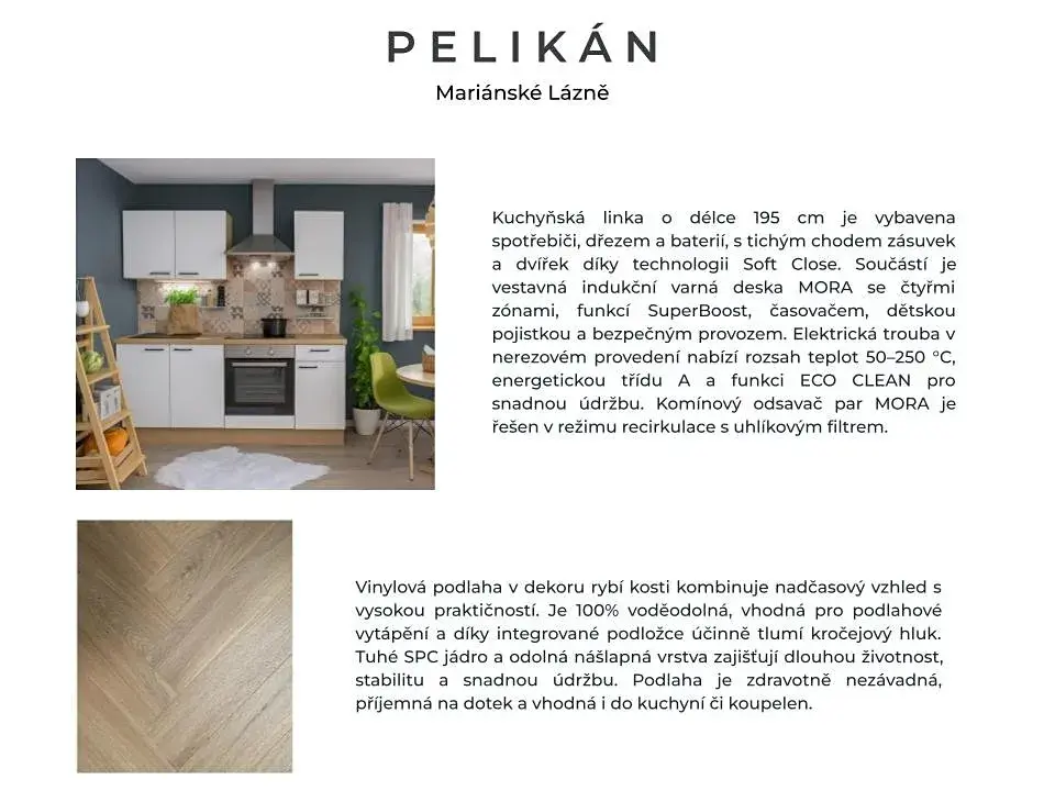 Jednotka je částečně zařízená a připravena k okamžitému užívání – součástí je nová kuchyňská linka a nadstandardně provedená koupelna. Koncept Nájemního domu Pelikán je postaven na dlouhodobém pronájmu, kvalitní správě a stabilním bydlení. Projekt reaguje na dlouhodobý nedostatek dostupných nájemních bytů v regionu a klade důraz na komfort, funkčnost a dlouhodobou udržitelnost bydlení.
