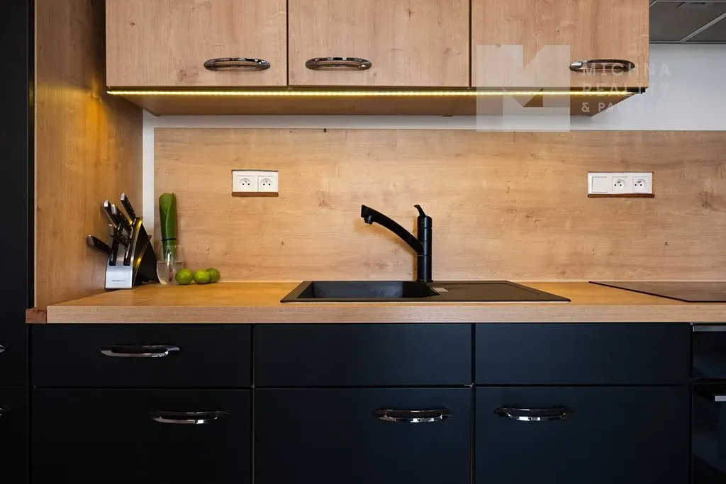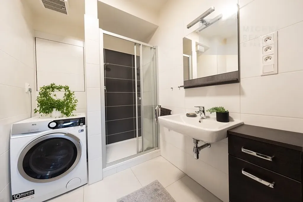 Bytová jednotka je vybavena kuchyňskou linkou s vestavěnými spotřebiči, klimatizací, elektronickými venkovními žaluziemi. V koupelně se nachází WC, sprchový kout, umyvadlo, pračka se sušičkou AEG a koupelnové skříňky.