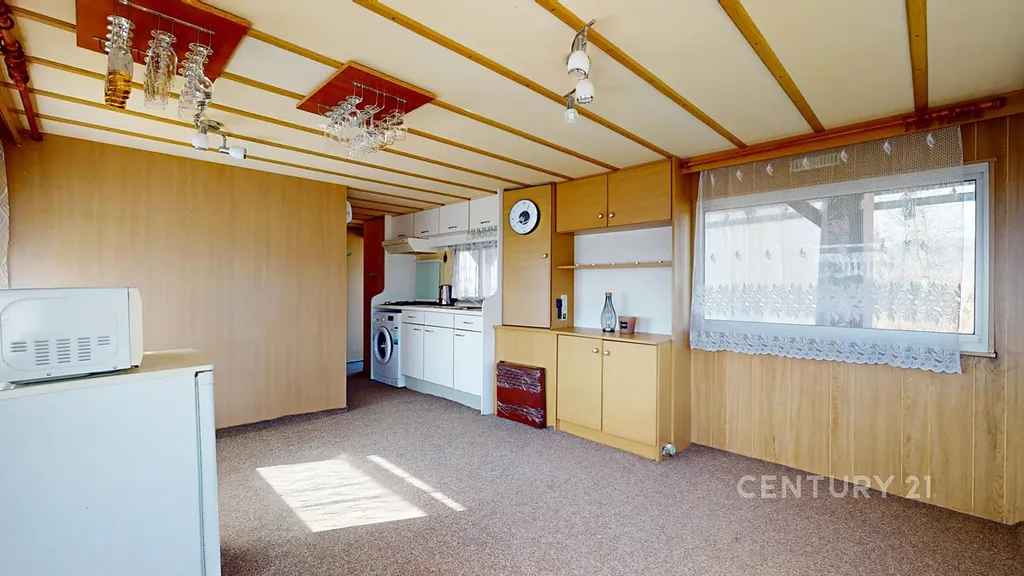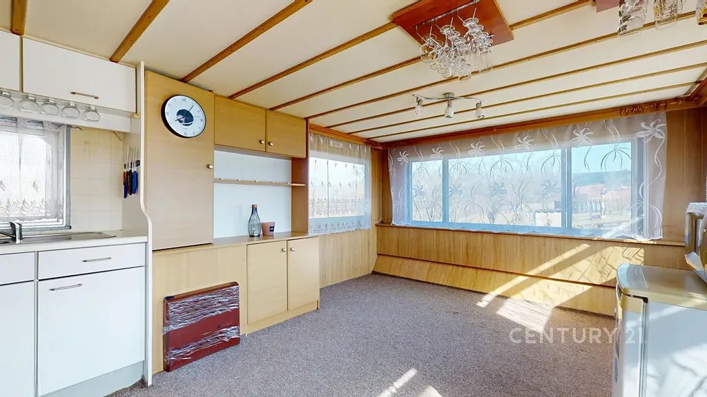 Celková velikost pozemku je 948 m². To je dost místa na bazén, ovocný sad, dětské hřiště i pořádný kus trávníku. Na pozemku stojí mobilheim 3+kk o zastavěné ploše 47 m², který je připojen na elektřinu a vodovod. Nejde o žádnou kůlnu na nářadí, ale o zázemí, které můžete využívat celoročně.