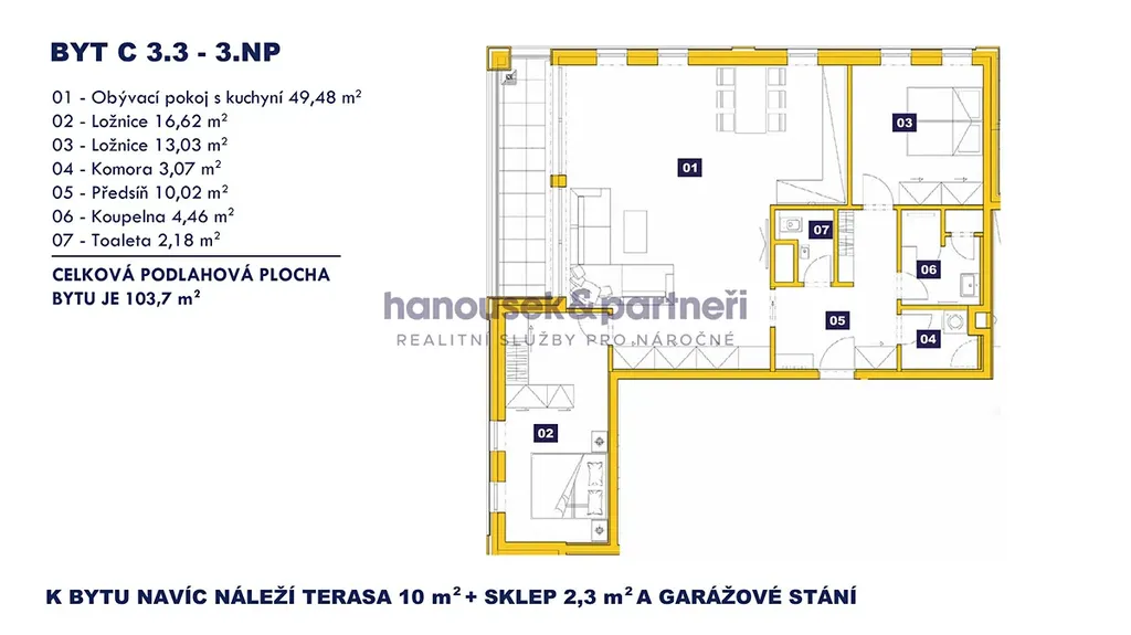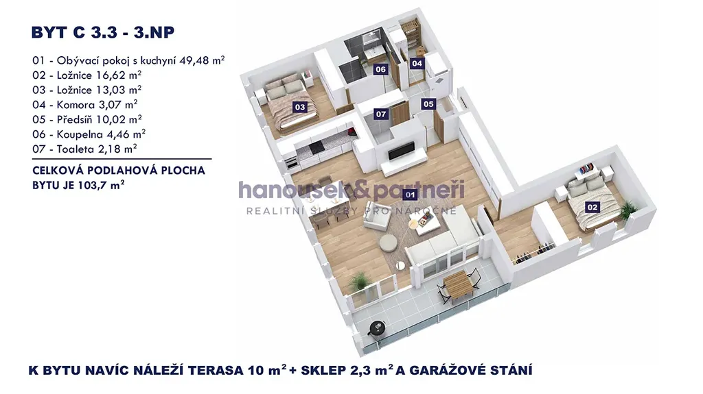 Nabízím vám byt s dispozicí 3+kk o velikosti 103,7 m2. V bytě je obývací pokoj s kuchyní, 2 ložnice, komora, předsíň, koupelna se sprchovým koutem a samostatné WC. Nachází se ve 3. patře domu C a navíc k němu patří terasa s výměrou 10 m2, sklep a garážové stání.
