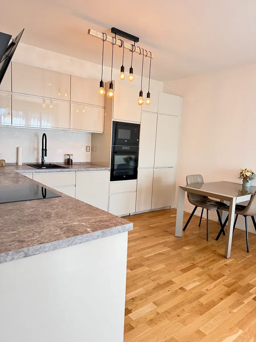 Interiér je zařízen v moderním stylu a byt se pronajímá kompletně vybavený, takže je připraven k okamžitému nastěhování bez nutnosti dalších investic. Dispozice je prakticky řešená a díky velkým oknům je byt krásně světlý a vzdušný.